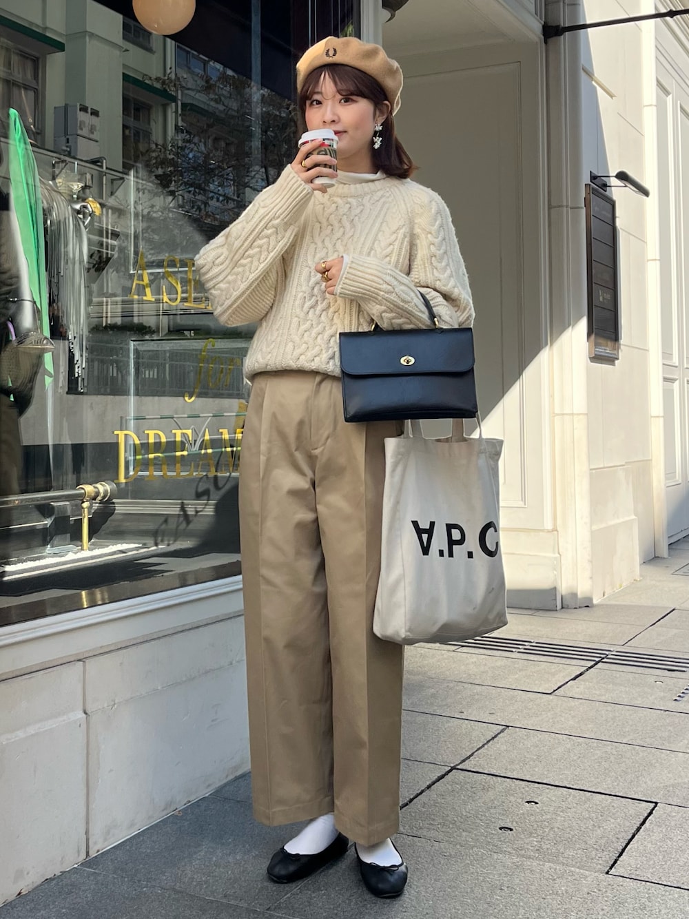 ベージュコーデに差し色の黒が可愛い🥨 バッグ2個持ちとベレー帽がいい感じ🗝 ちょっとした拘りがコーデを華やかにさせててツボ。、