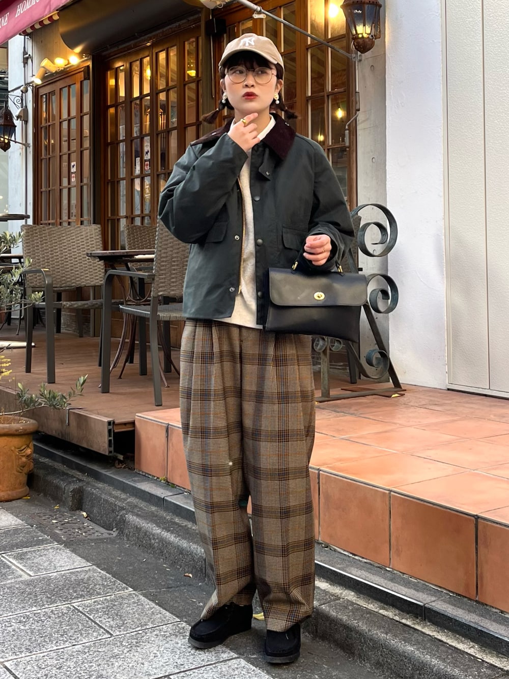 渋めのコーデだけど、キレイめカジュアルさもある💡 Barbourだけじゃ渋いのでメガネやキャップでキレイめカジュアルさを出していきました🧢