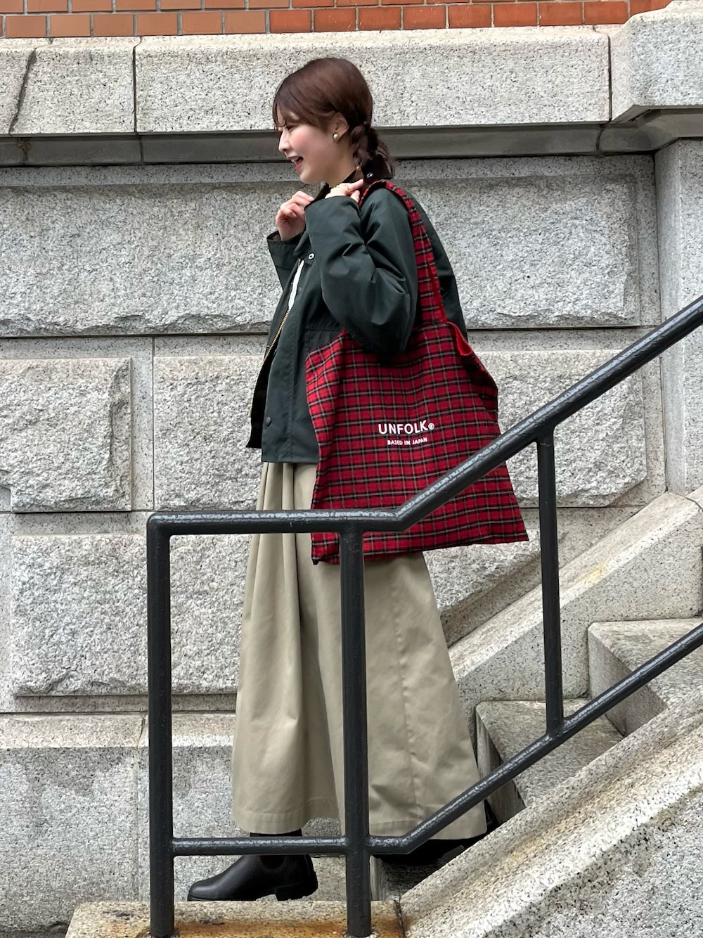ジャケットにスカート、ブーツだと 少し渋め要素が強いので赤チェックのトートで 女の子らしさをプラス📌