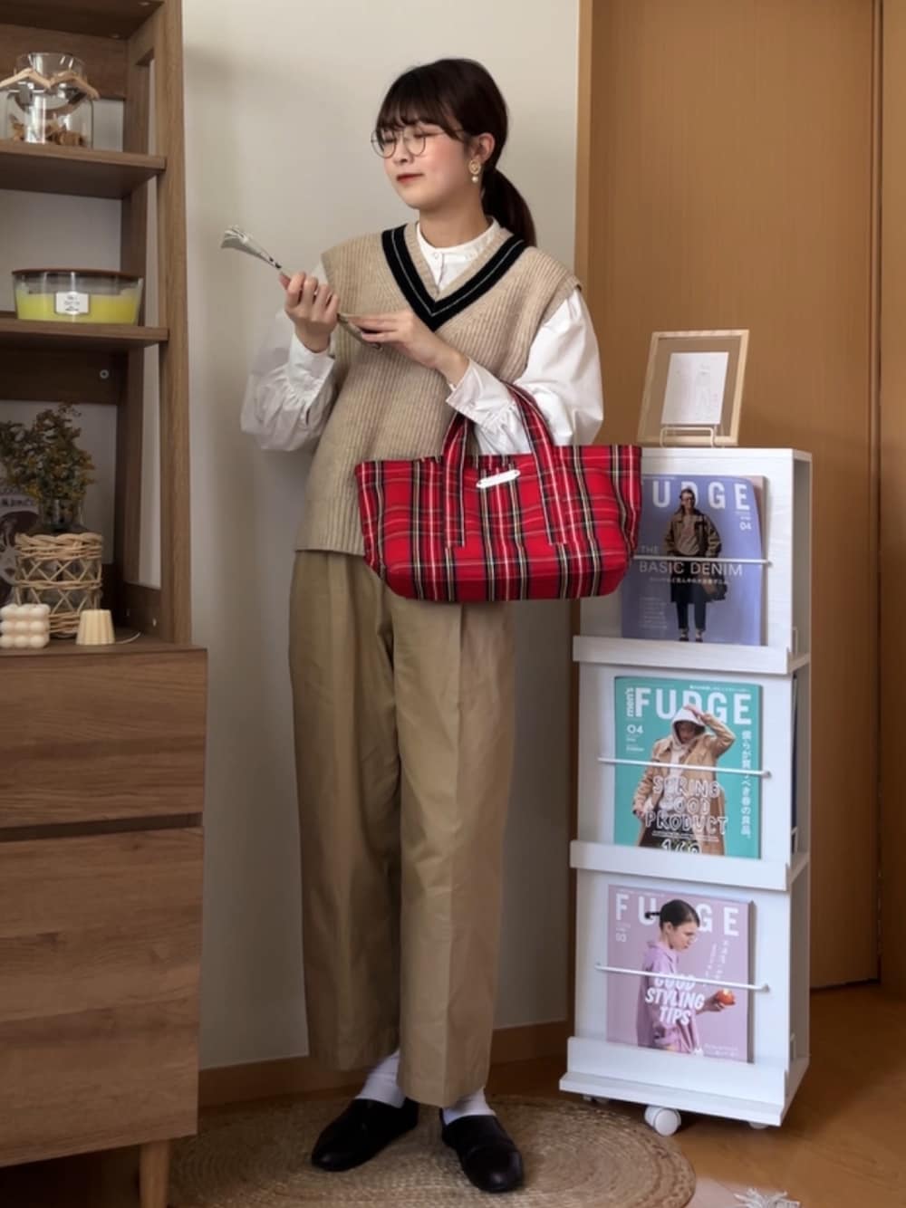 ベージュコーデ🍮ちょっと肌寒い日とかには ベストのレイヤードをすれば暖かくなるよね^_^ 赤チェックバッグが差し色で可愛いの!!