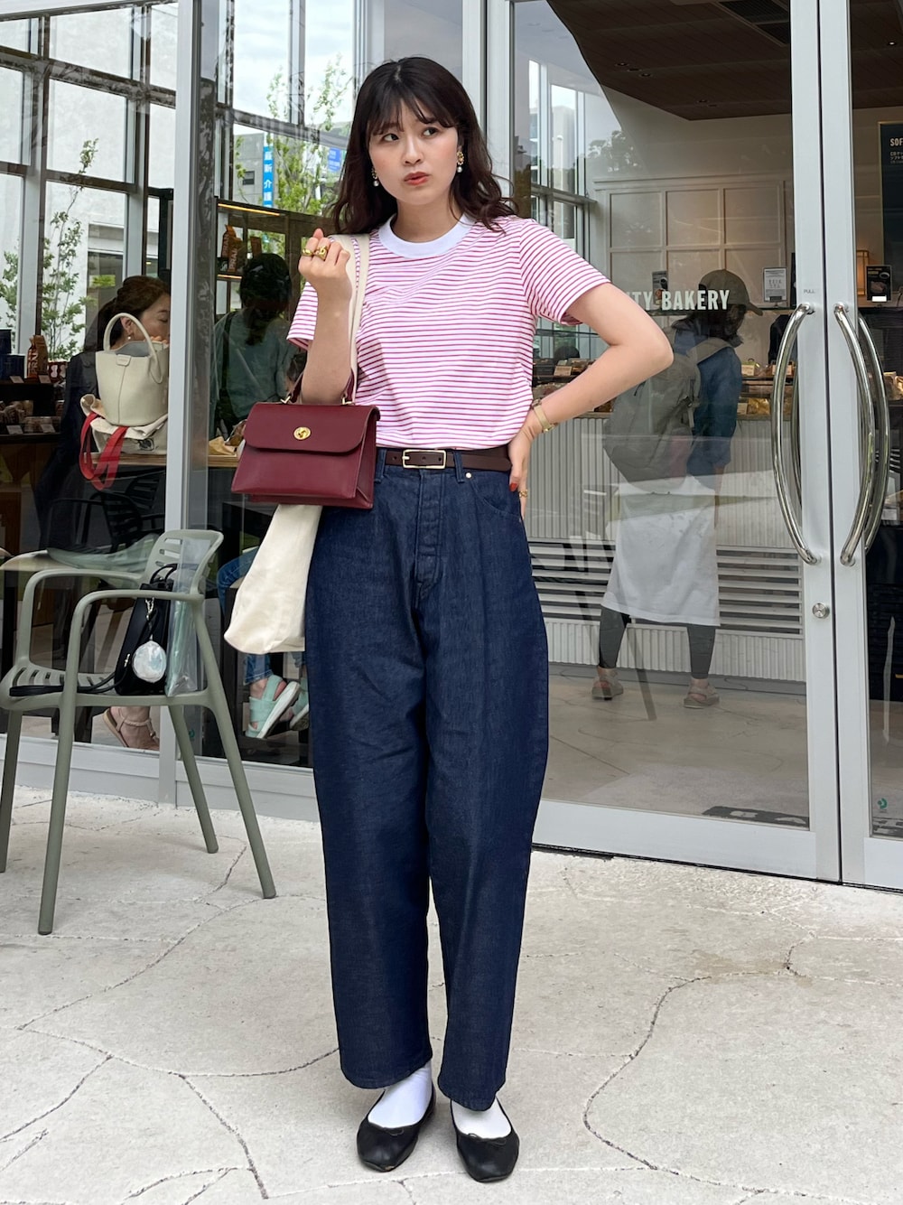 赤のボーダーがコーデを明るくしてくれる!!それに合わせて赤バッグをチョイス〇 どれもデニムによく合うし可愛い〜〜·͜· ︎︎