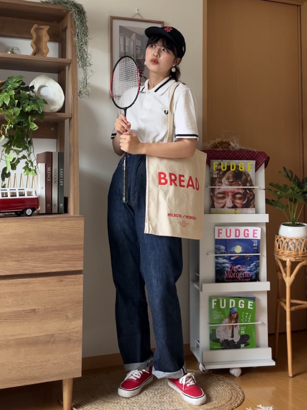 FREDPERRYにはデニムはもちろん合う!! 小物系は赤でちょっと明るい色を 付け足すことでコーデが華やかになる🇫🇷
