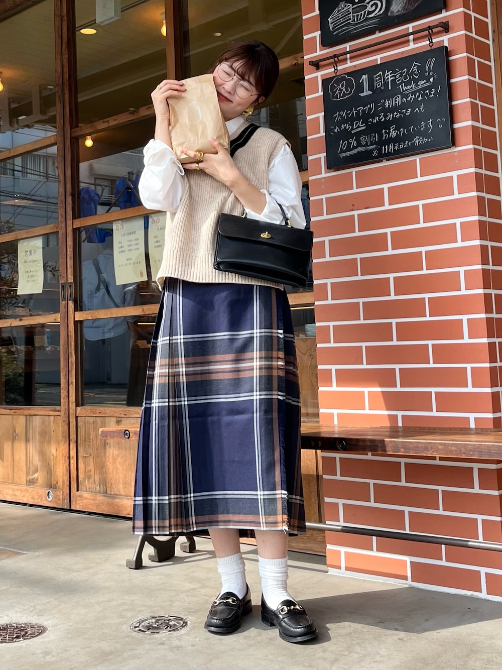 オニール履くだけで雰囲気あるけど、 レイヤードしたベストを合わせると さらにトラッド感がでて可愛いんです!!✊🏻 メガネも大事だよ!!!小物はブラックで まとめてシックに。