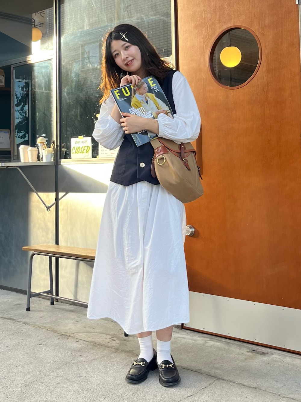1枚じゃ物足りなさに、ベストをレイヤード◎ 足元も上品さをプラスしたくて革靴を👞🤍 ワンピースの時は大きめのショルダーバッグがいいアクセントになるよ!!