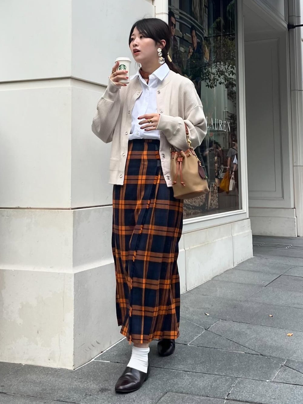 秋らしいカラーのオレンジチェックのオニールを🍊 それに薄めのガーディガンを◎ 首元にはオレンジの色を拾ってunfolkの スカーフをポイントで巻いたよ!