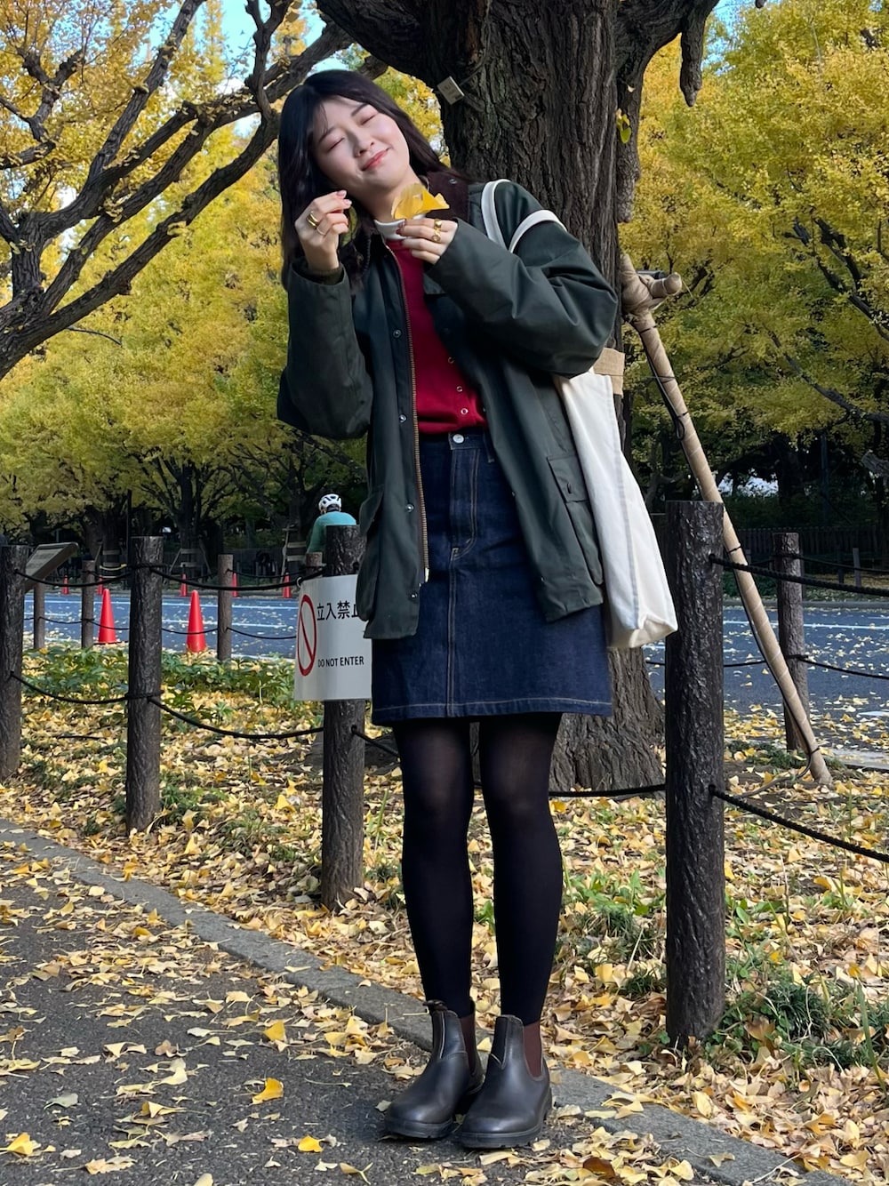 外苑前の銀杏並木に!🍁🍂 久しぶりのデニムスカートにBarbourのビデイル!この丈感の組み合わせが素晴らしく可愛いの〜!😄 足元は秋らしくブーツで🧦🥾