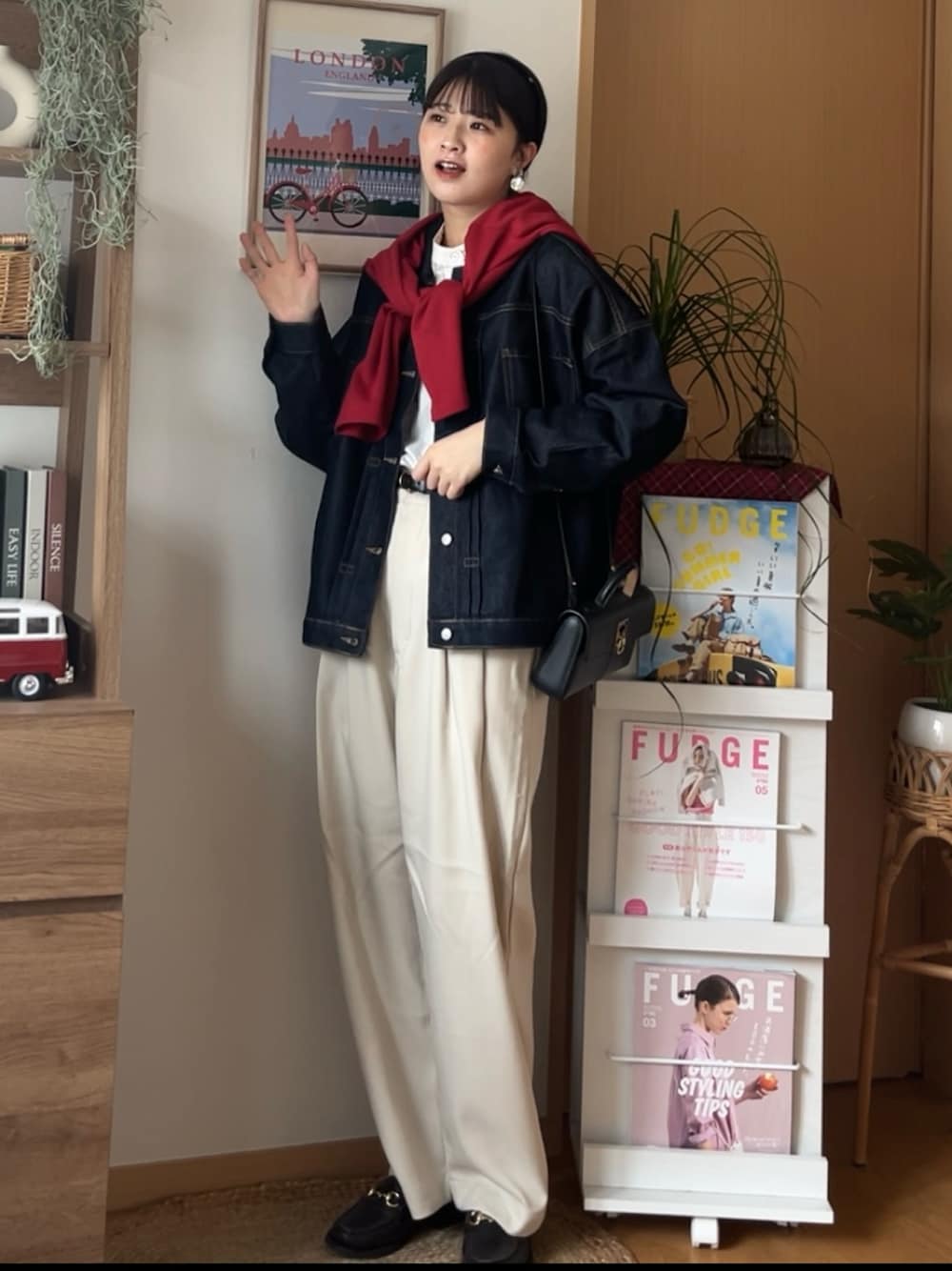 春は【デニム】を使いたい!ということで… 白パンツに合わせてみました! 差し色は赤が可愛いです❤️🐶 カチューシャを付けたりするのも 女の子らしくて可愛い🙂↕️🌟