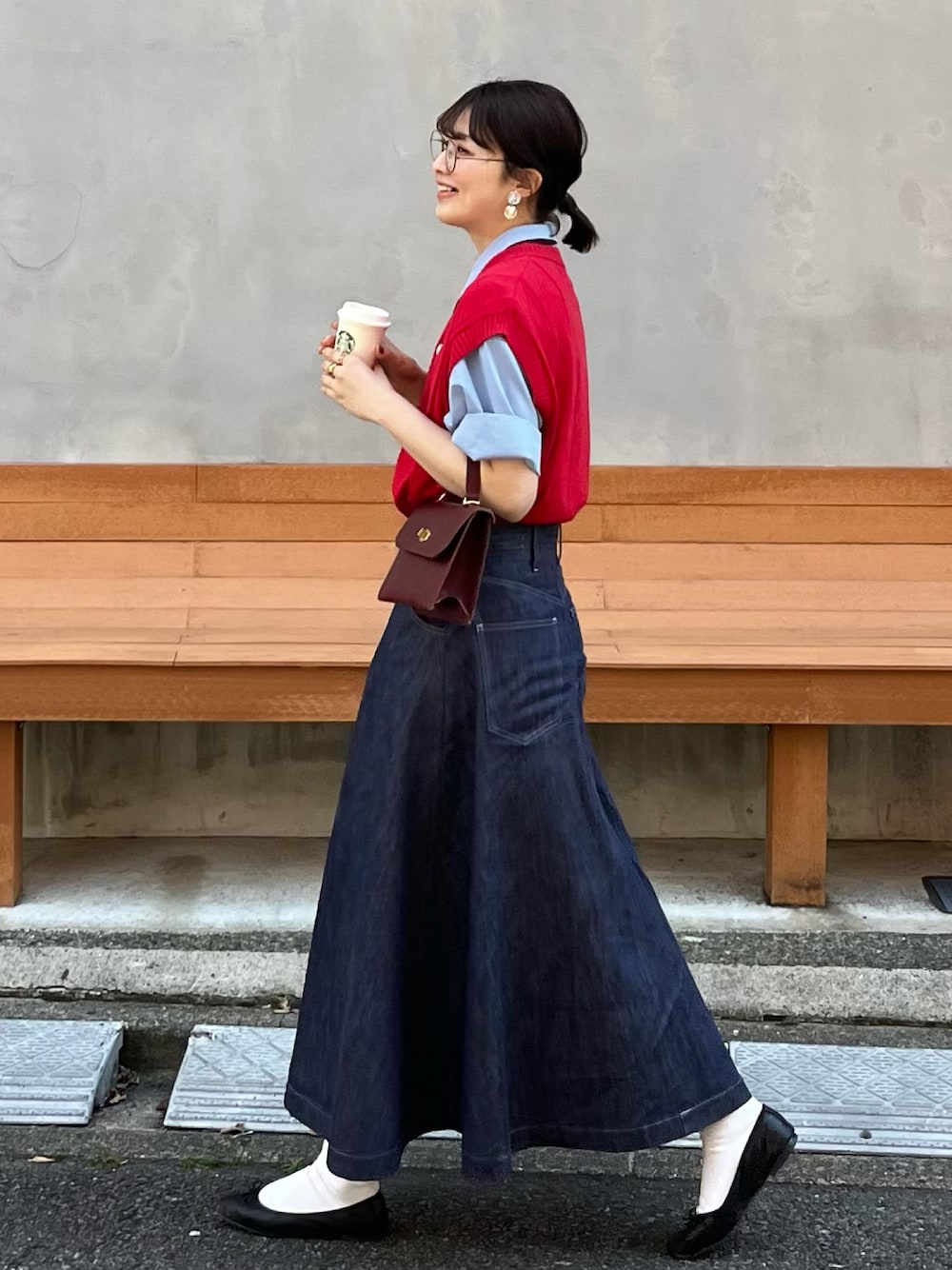 UNFOLKのデニムスカート☺️ 赤ベストを合わせてトラッドに☝️