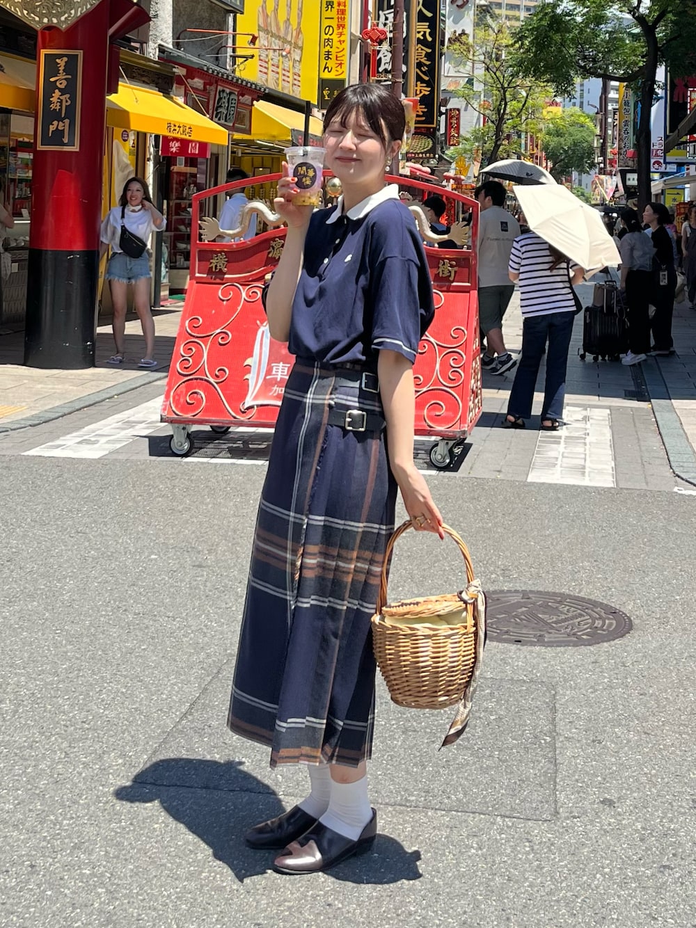 ネイビー同士の組み合わせにかごバッグの 夏スタイルが可愛い〜〜の!!🧺💗
