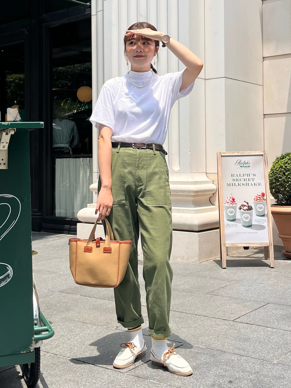 夏はベイカーパンツで遊びたい!! と思ったので、薄めの生地感のハイネックtを 合わせたよ。 足元はTimberlandのおにゅーで🥾🤍