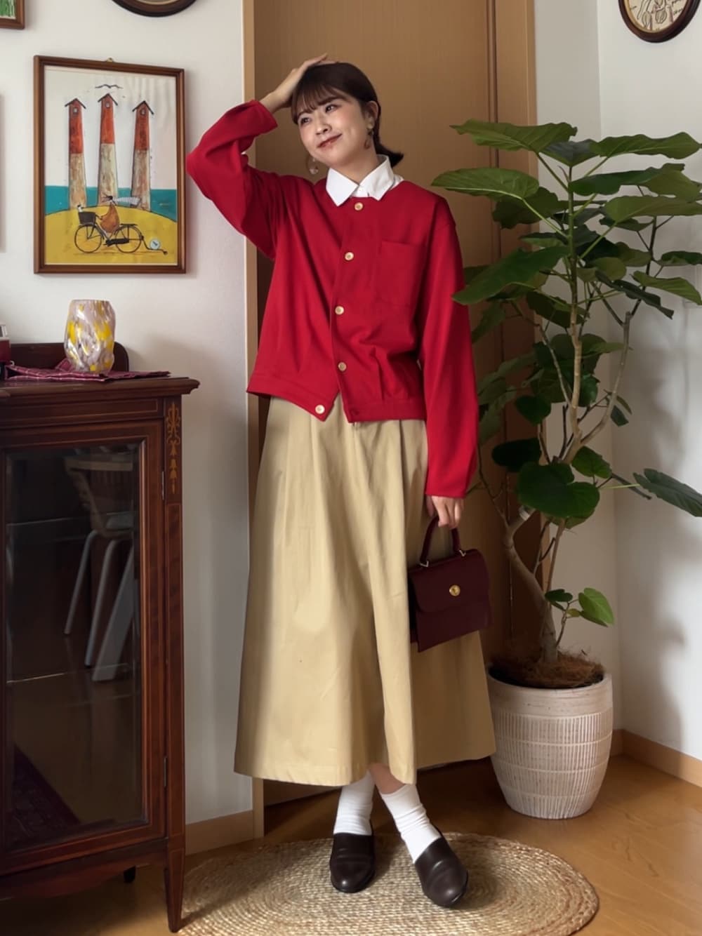 AWの赤カーディガン可愛すぎて着ちゃったんだけど、夏だったら肩掛けとか、腕まくりして 可愛く着るのもありだよ📌ෆ トラッドの必須アイテムはこれだな〜🇬🇧 シャツをレイヤードして奥行出すのも◎