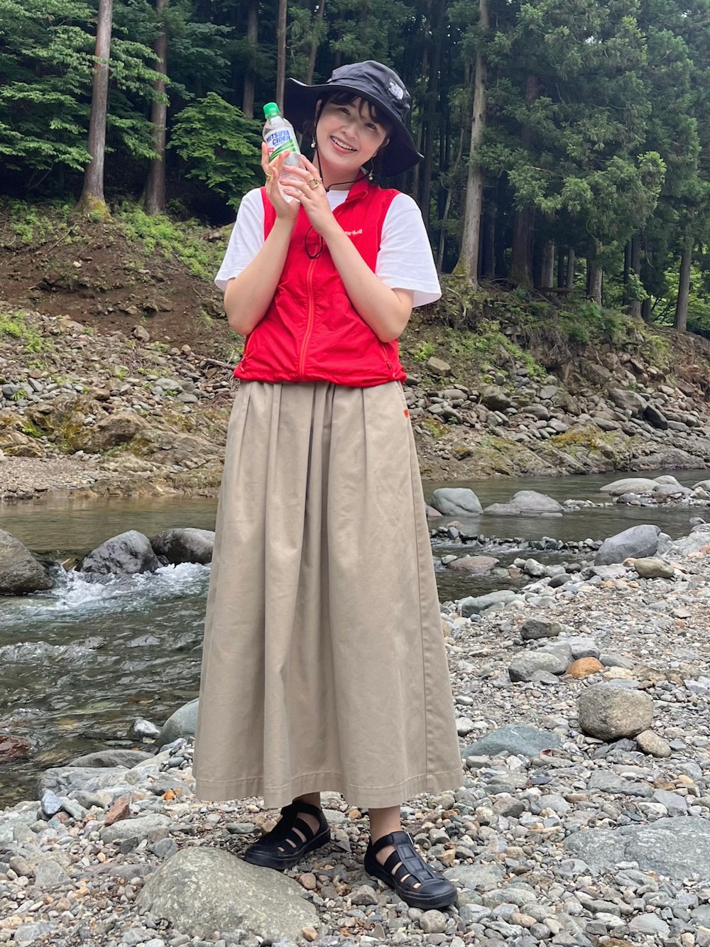 アウトドアコーデだけど、赤ベストを使って トラディショナルな雰囲気もプラスしました❤️🇬🇧 ハットを被ったり、夏らしいグルカサンダルで お洒落しました💃✨