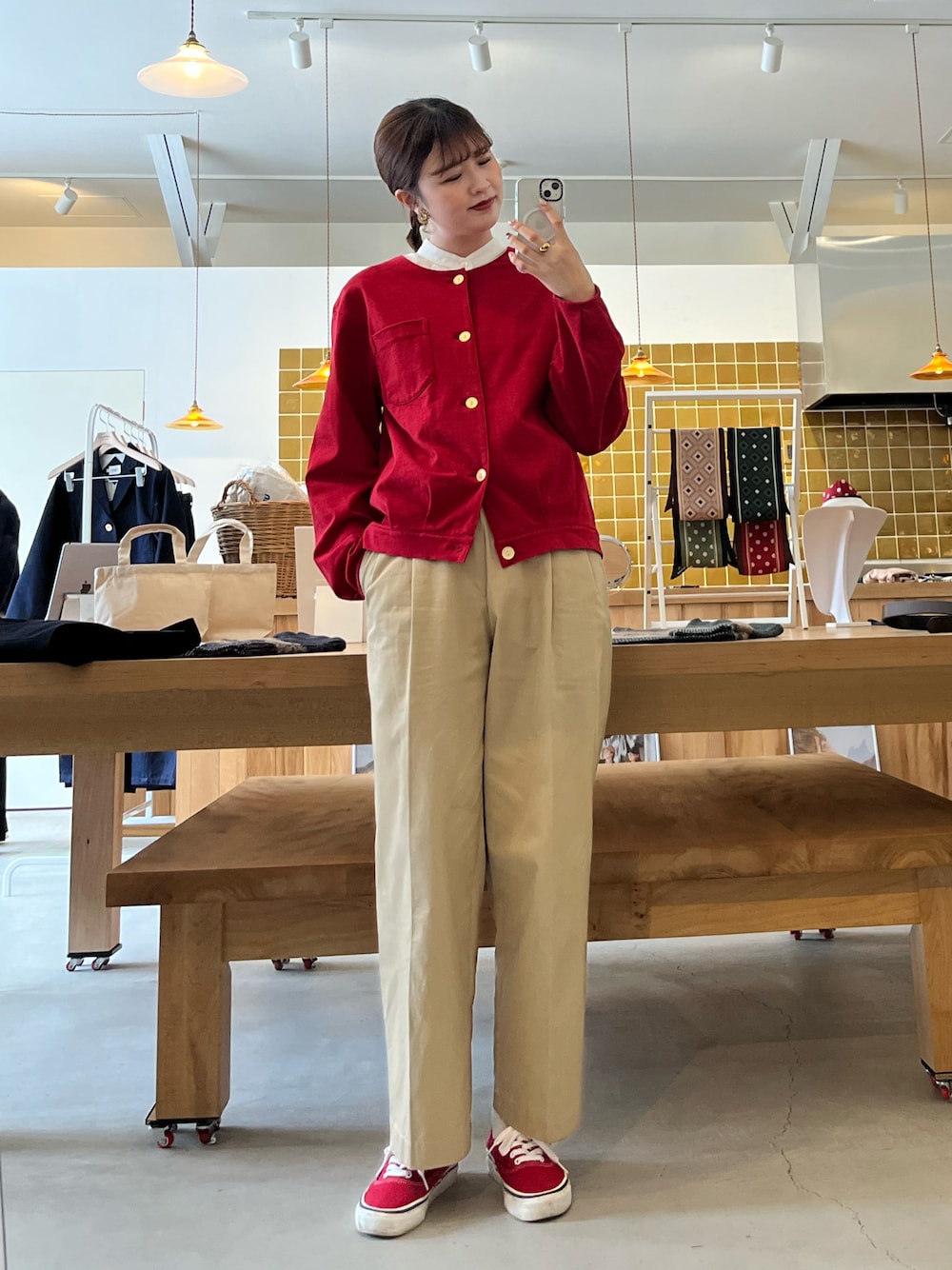 POPUPなので秋コーデになっちゃったけど どれも夏使えるので🙌🏻 チノパンをベースに赤カーディガン×赤VANSでサンドイッチ📕♥️ 首元には白シャツを見せて奥行きを。