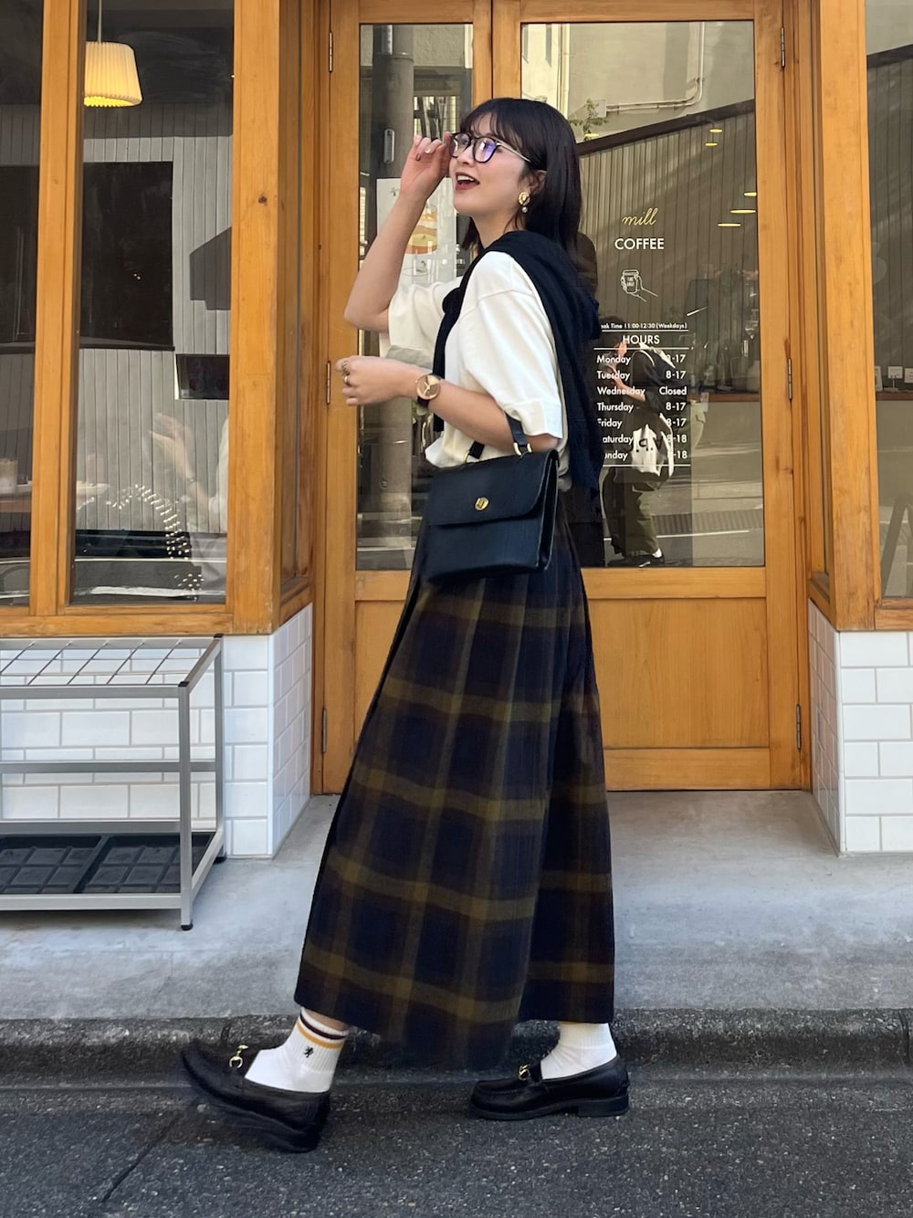 UNFOLKCLASSICの25awの新作スカートをメインに。 シルクTシャツや、靴下で白を足しつつ、小物や靴、メガネで黒を付け加えて モノトーンだけど黄色のチェックが主役になれるコーディネート💛🌼