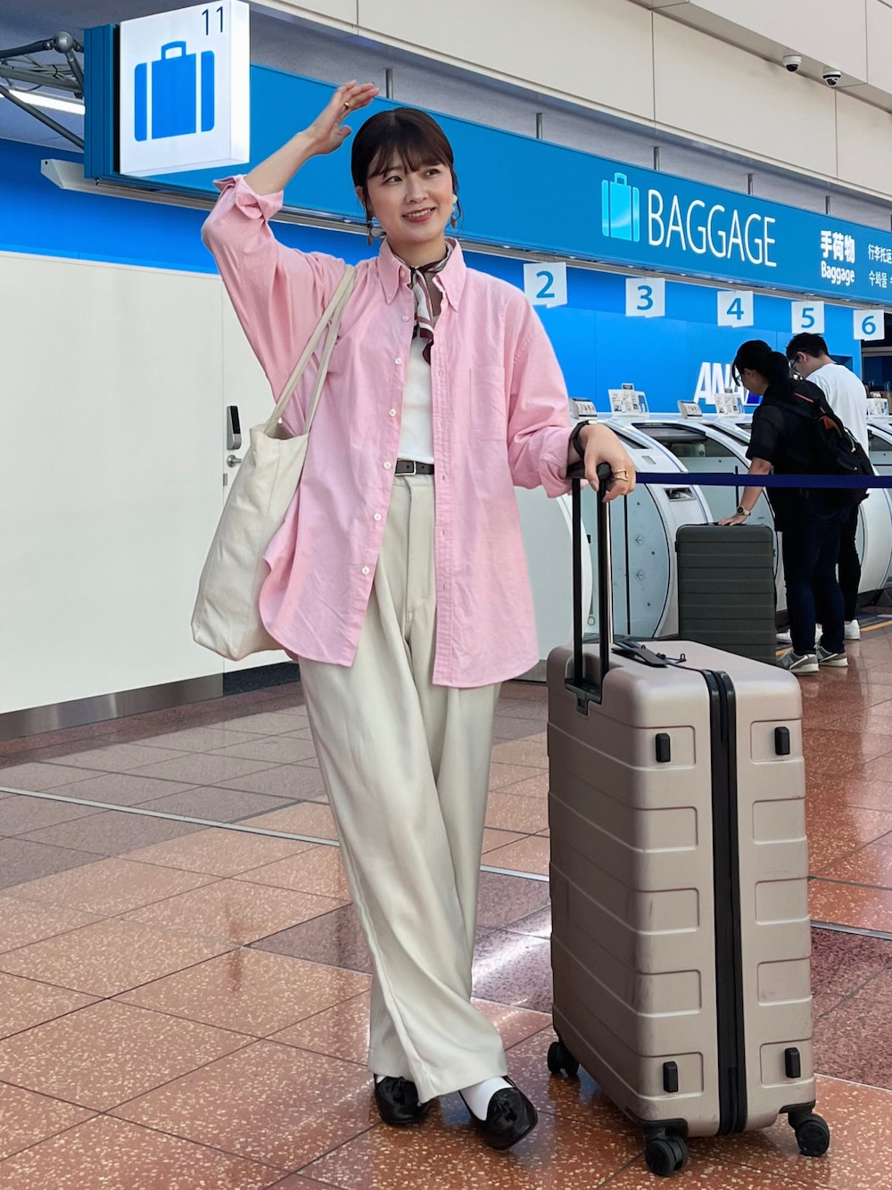 空港コーデ✈️機内はちょっと肌寒いと思うのでシャツの羽織スタイルで、白パンに合わせて甘めに🍑 でもちょっとスカーフをつけて周りと差を出すと◎UNFOLKのスカーフを付けたよ☺️