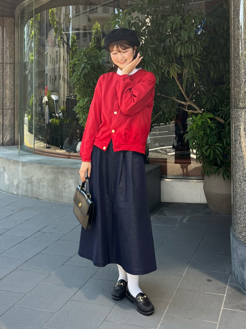 イエべ秋なので、もう早く秋こないかな?と うずうずしております🍁🍂笑笑 赤いカーディガンにデニムスカートは定番合わせだけどそこに、ベレー帽が来ると一気に ブリティッシュな雰囲気になるよ🇬🇧✨️📕