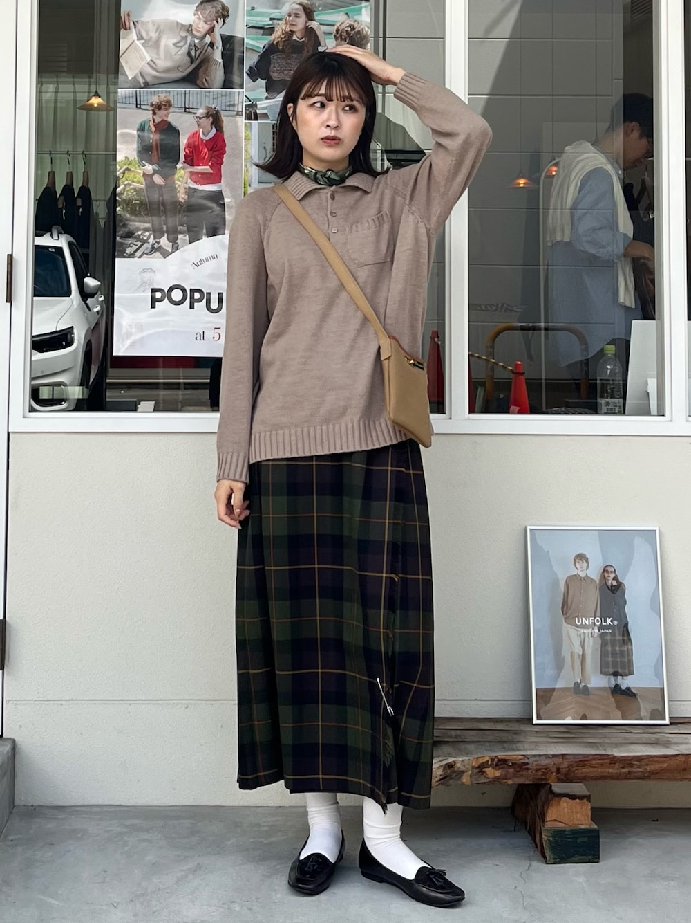 カーキのオニールを使ったコーディネート✨ 秋の始まりはオニールで沢山遊びたいので、 色合わせでUNFOLKの新作スカーフを付けてみたよ🎗️