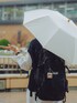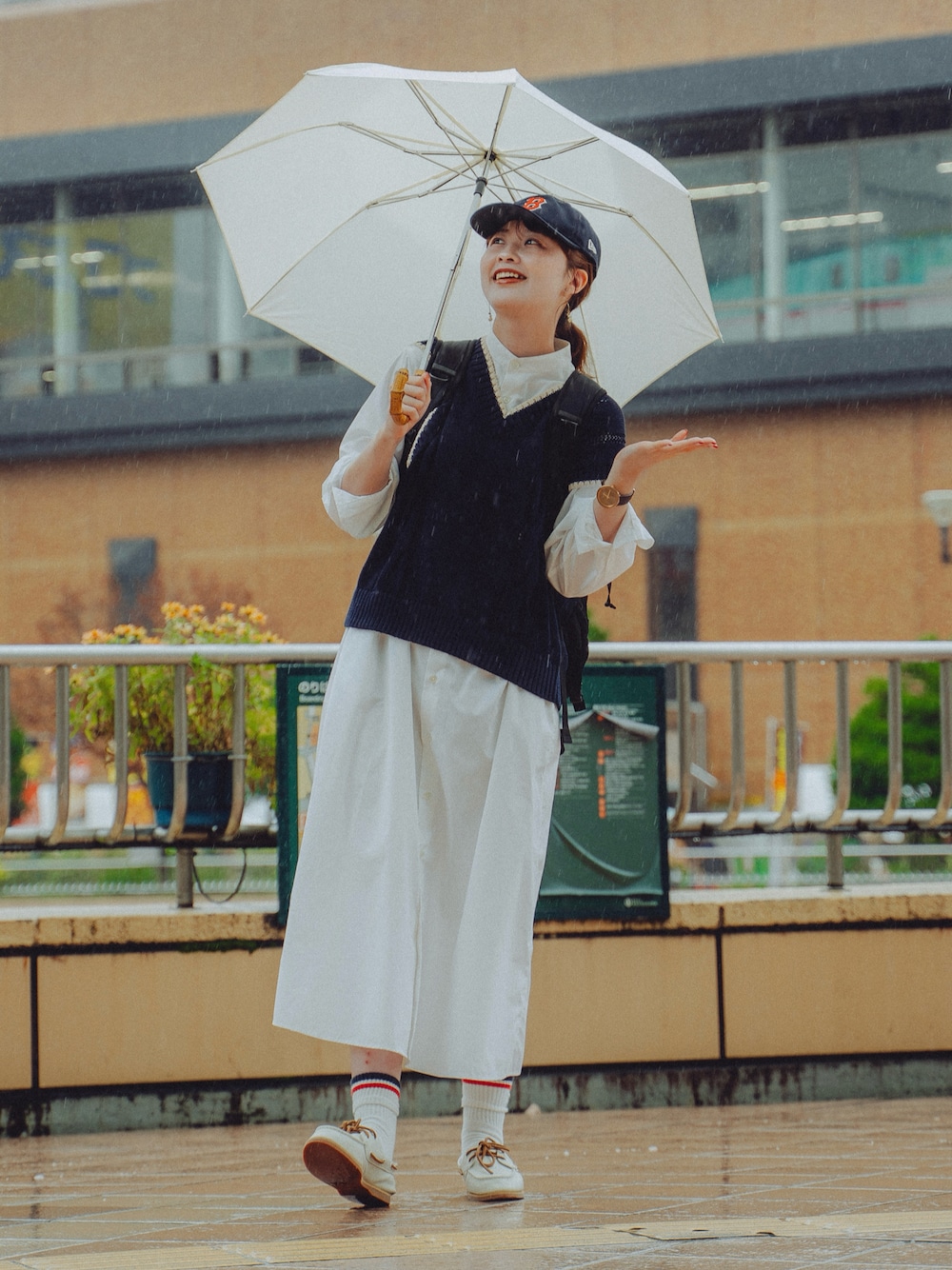 レイヤード抜群な白ワンピースが主役の日! twwのベストをレイヤードして、色合わせのキャップが可愛い🧢 足元と傘は白で統一感を出すと◎