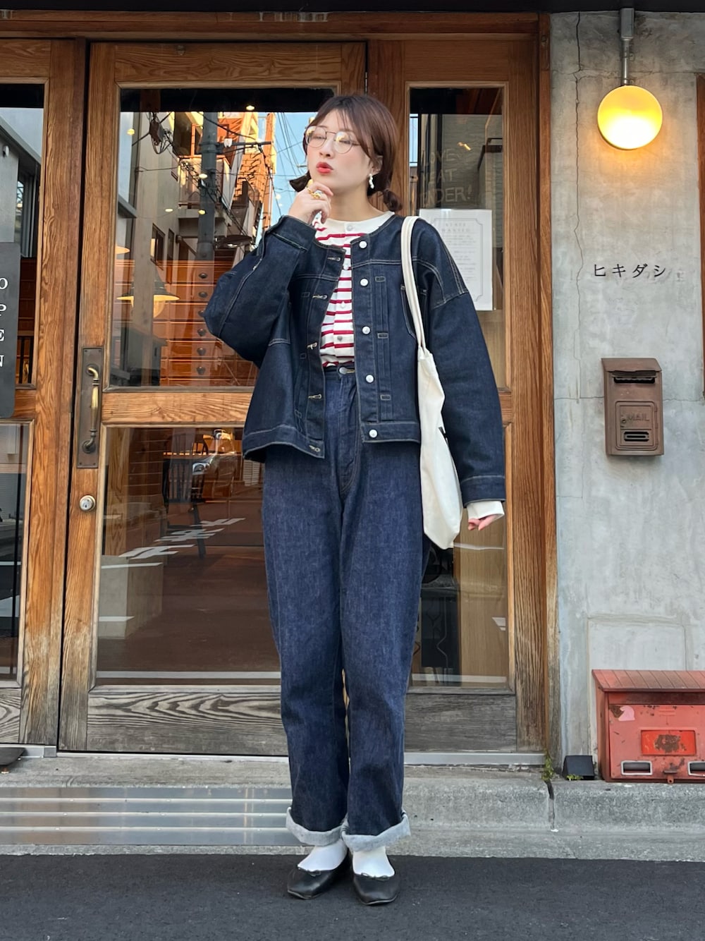 秋のアウターはデニムジャケット!! anatomicaのパンツが優秀すぎて インナーのunfolkの赤ボーダーの差し色と よくあってて可愛い🥺✨❤️