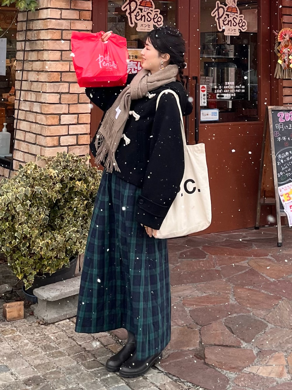shinzoneのダッフルコートを 着てパン屋さんへ👩🏻🍳🥖 ショート丈なので、スカート履くと 足長く見せてくれるからおすすめ組み合わせ✨️