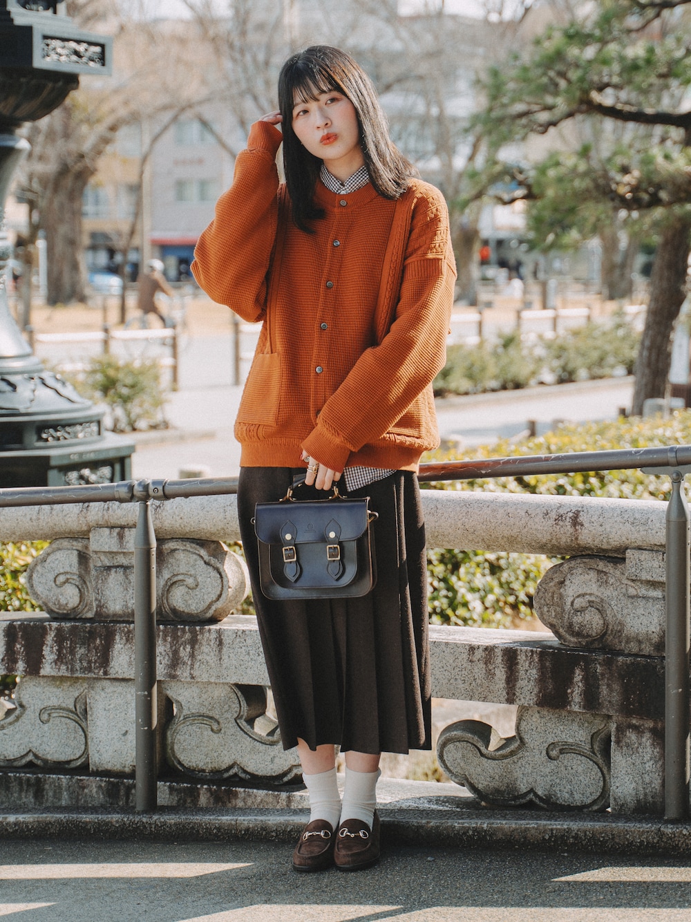 YASHIKIのカーディガンに ONEILOFDUBLINのブラウンスカート! オレンジブラウンって色味の組み合わせが 絶妙に可愛いんだよね〜👧🏻🧡 足元やバッグにはゴールドの金具をまぜたのも クラシカルなポイント◎🔔