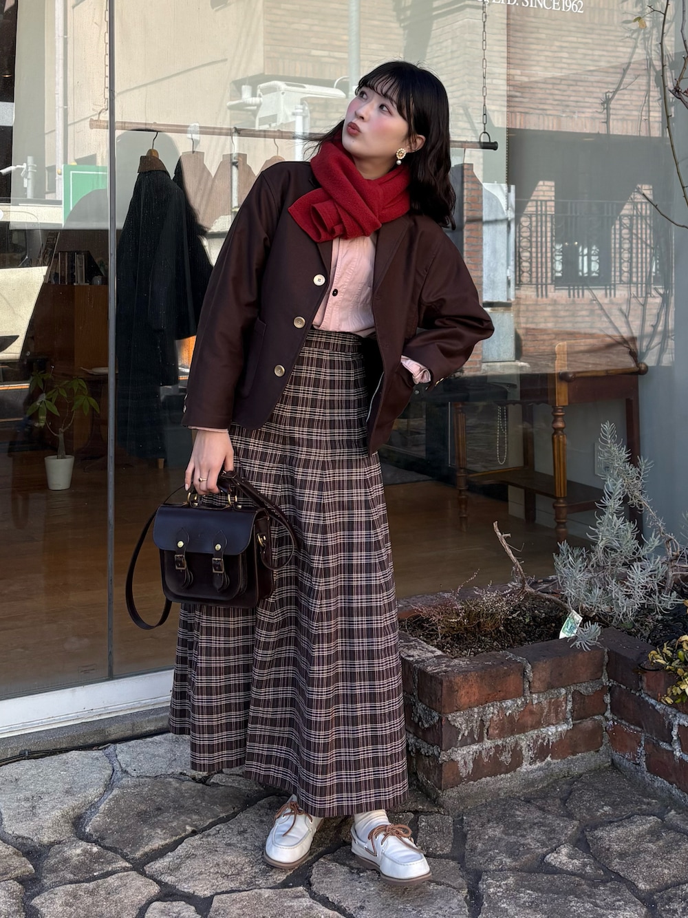 ブラウン×ピンク(濃いめ)これやって見て欲しいの!🍑 モールスキンのジャケットがかっこよすぎて 本当に重宝してます!!!!🤎 今は赤のマフラーとかして差し色入れるのも可愛かったなぁ🧣 足元は奥行きを出すために白いtimberlandを合わせたよ👟