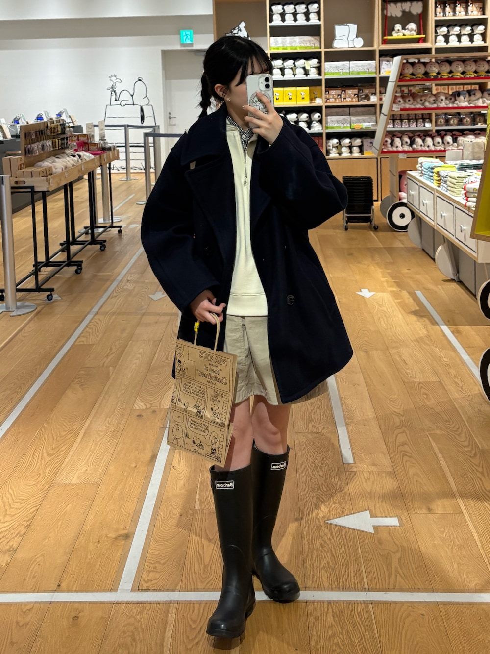 スヌーピーミュージアムに 行った時のコーデなので全身鏡で🪞🐶 インナーにはキツネのハーフジップを着てるよ! Pコートはオーバー目なので、ミニスカ履いて ロングブーツの雰囲気で🥾 本当に可愛くてお気に入りです!^^