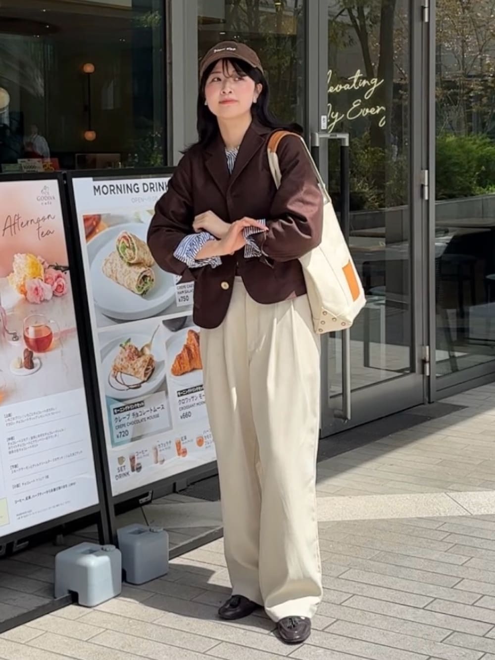 モールスキンのジャケットがカッコイイ!! ブラウンって青と相性合うから、 ストライプシャツを入れたり、 でもブラウンキャップや革靴でコーデに 統一感をあげると⚡️⚡️ この日は仕事の日でした〜!!💻