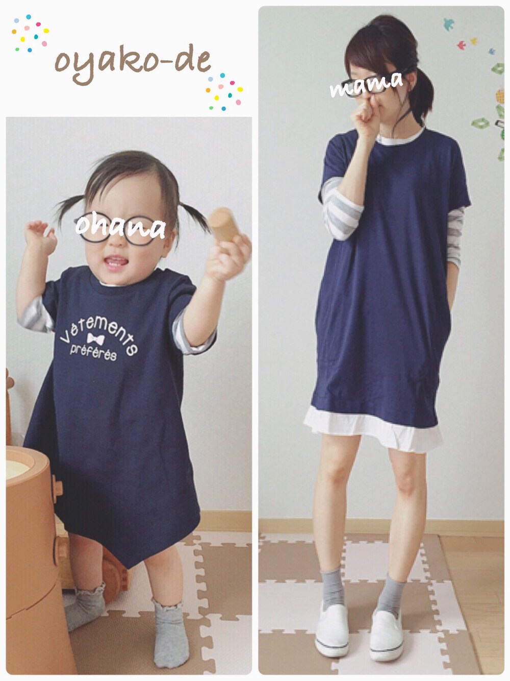 今日もネイビーかよ、いい加減にしろ👋🏻と自分に言いたいコーデ。 やってみたかった、オーバーサイズのトップスをワンピっぽく着せるやつ❤️(長いわ、何て言うのかしら。) Tシャツは100cmです。 母のワンピも、ZOZOのセールでめちゃ安でした✌🏻️ 小さいサイズ売り切れだったけど、結構裾短かったし、結果大きいサイズでよかった💦 リトルマミー、あやうく引っかかるとこでしたー!(勝手に。) ネット通販ムズカシイ。 見てくださって、ありがとうございました😊