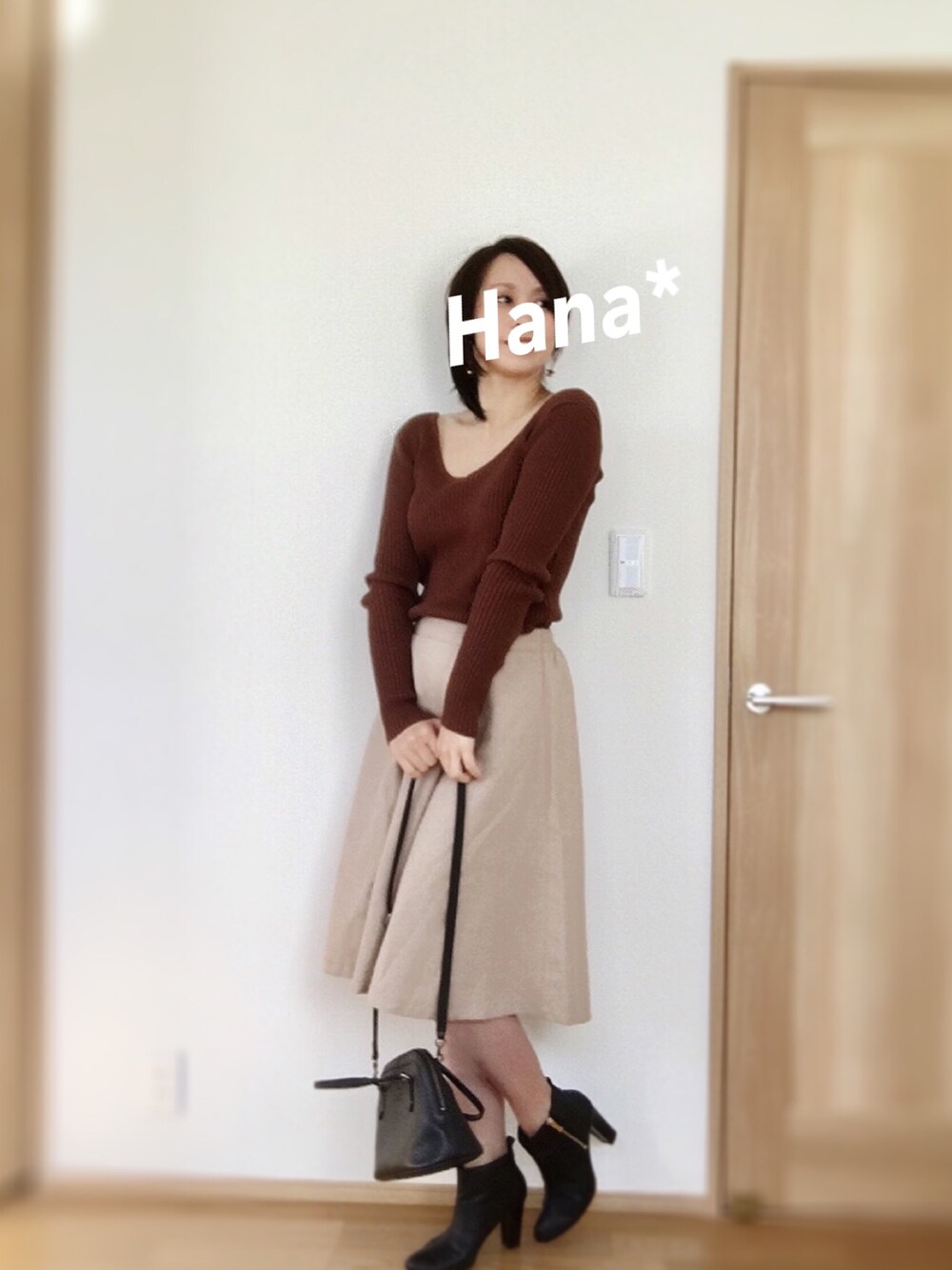 大人の遊び心ある休日コーデです(*^^*) ニットとウールのフレアスカートがカジュアルテイストですが、レザーの小物できちんと感を出してみました♪ 深Vネックでみせるデコルテラインはアラサー以上の大人女子がアピールできる専売特許ではないかと思っています笑