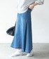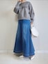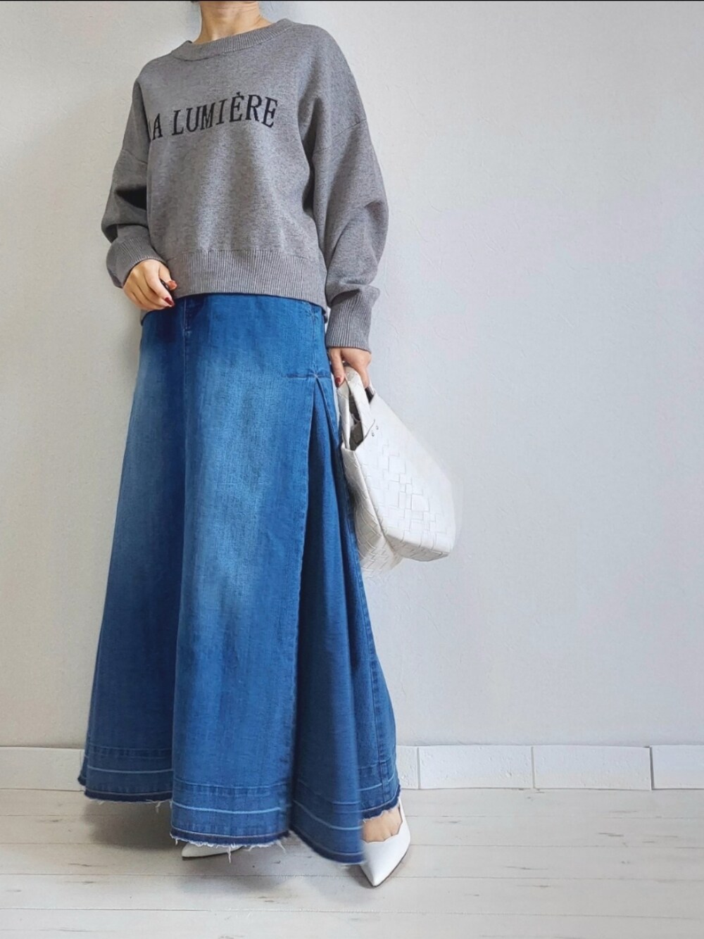 ひとくせアリなデニムスカートが新鮮! ショート丈ロゴニットとのバランスも◎ 私の身長だと、スカートはヒールがマストでした。