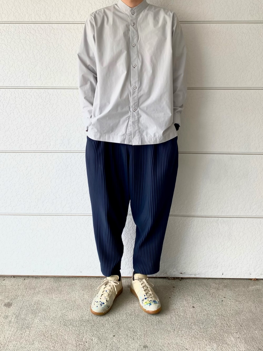トップス、パンツはhomme plisseで綺麗にまとめ、足元はマルジェラ(マルタン期)のペイントジャーマンで雑念入れました。