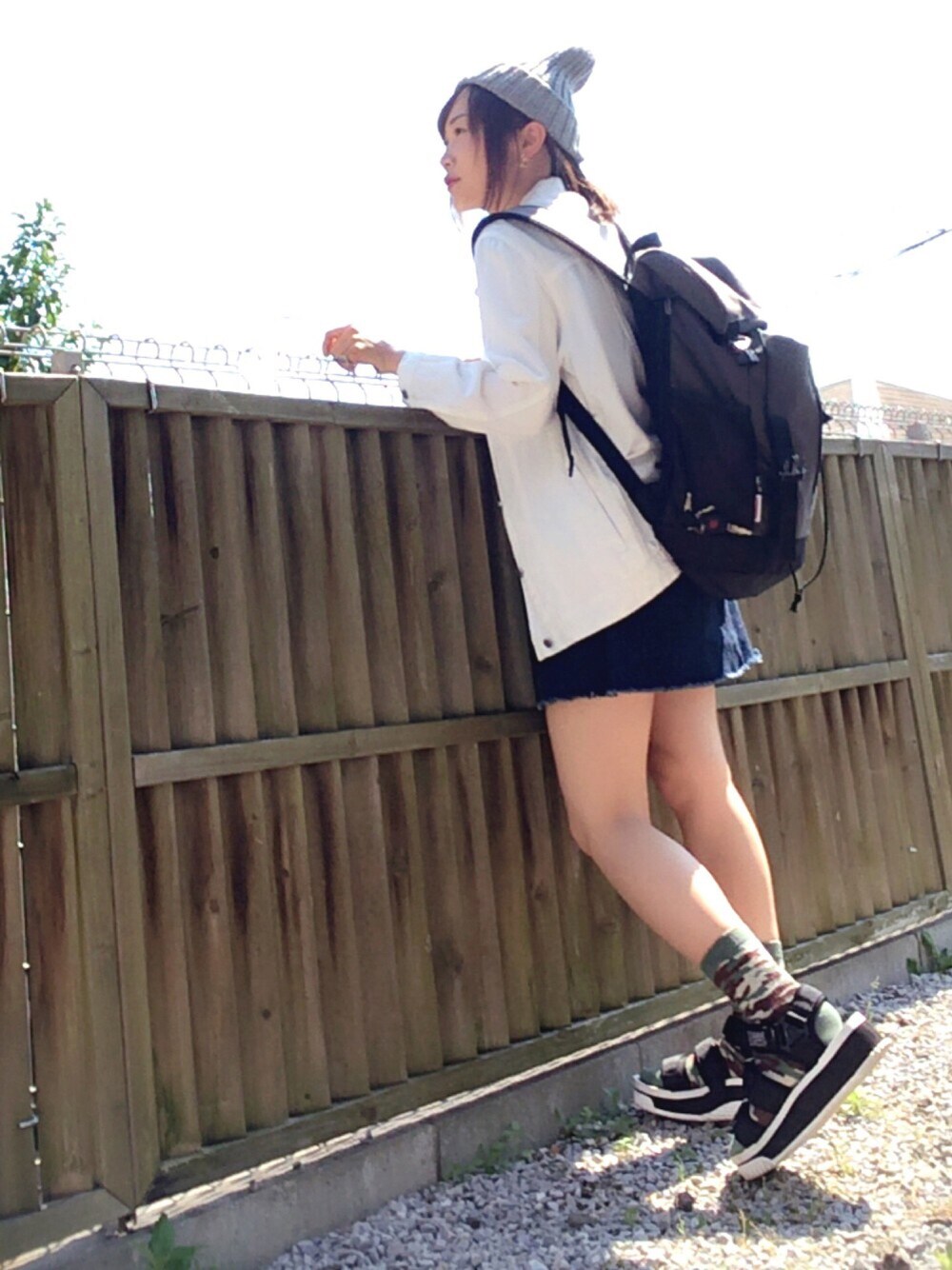 デニムの切りっぱなし 台形スカート 白いデニシャツ羽織って クリーンさわやかに着る ふっとい足出して さわやかもなにもない 中には黒T着てる 無地でまとめて 子供っぽくなりすぎないよーに しかしとことんカジュアル GUのソックスは 5枚組のやつ 5枚であの値段はありがたや