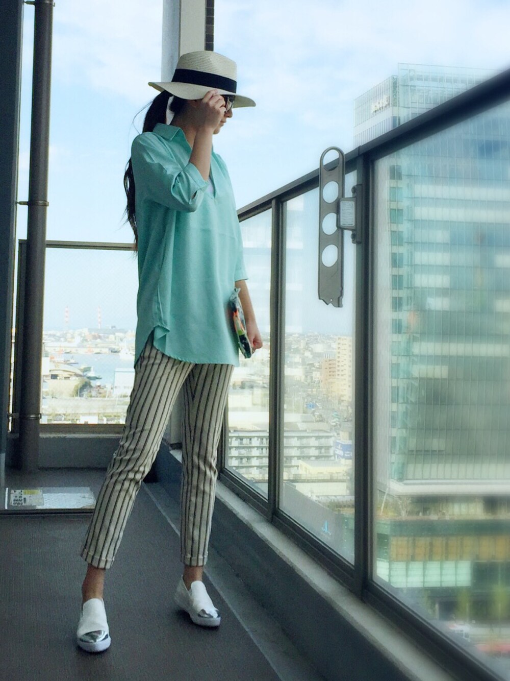 春夏っぽくグリーンシャツ×ストライプパンツ♡