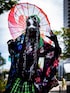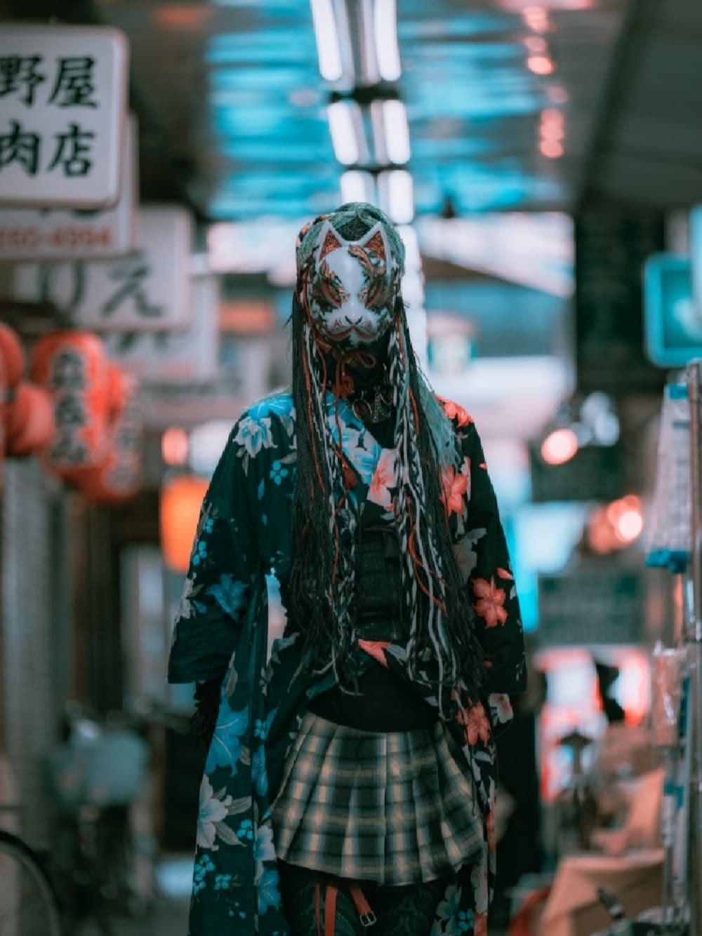 AI画像と言われてしまいましたが。撮影は堺市の居酒屋街にて撮影しております。 靴やスカートは比較的にPUNKショップやゴシック系で買った物に ハンドメイドで浴衣を作ってます お面は比較的に高額であり九州メーカーであり 朧(おぼろ)言います 浴衣自体も自主製作なので売っておりません 浴衣は身丈190cmで浴衣だけどロング振袖を施します。