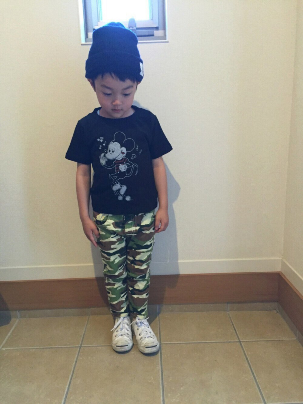 このミッキーTデザインに惚れました☻この夏ヘビロテします。でもワンサイズ小さめを買ってしまった(>_<)パンツはやっぱり迷彩。落ち着く〜‼︎形が可愛いくてお気に入り。 下の子のも買おっかなぁ♡