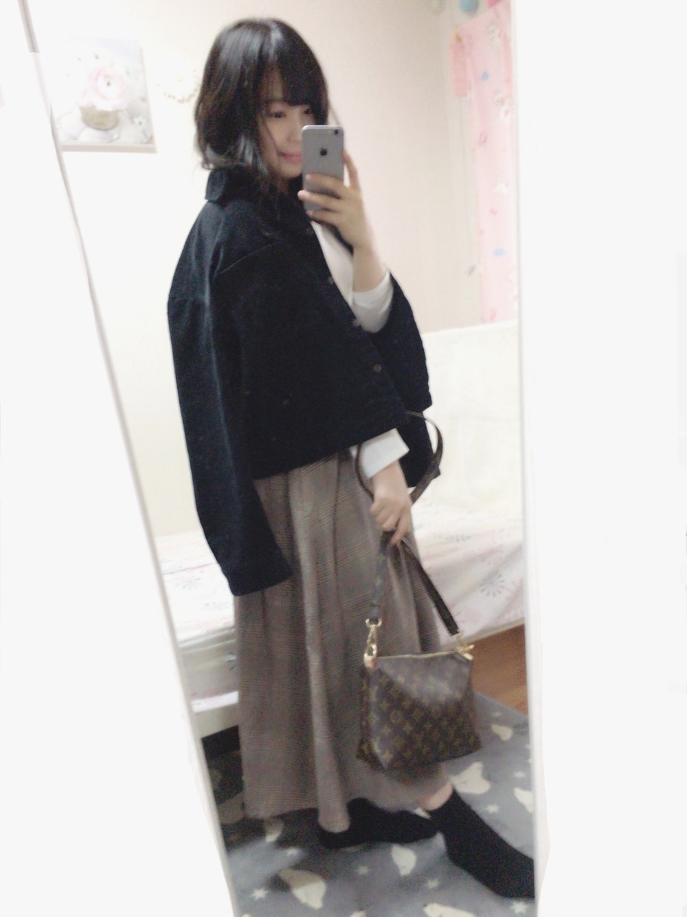 久しぶりの投稿です♡! 今日は美容室へ行ってまいりました(*´ω`*) 約20㌢カットして秋なので暗めの髪色に染めてもらいました! この長さ何年ぶりだろうか、、、(*´ω`*) さて! 今日はGUの黒いアウター+前回も載せたグレンチェックスカートです♡ゆったり着れて楽ちんです♡