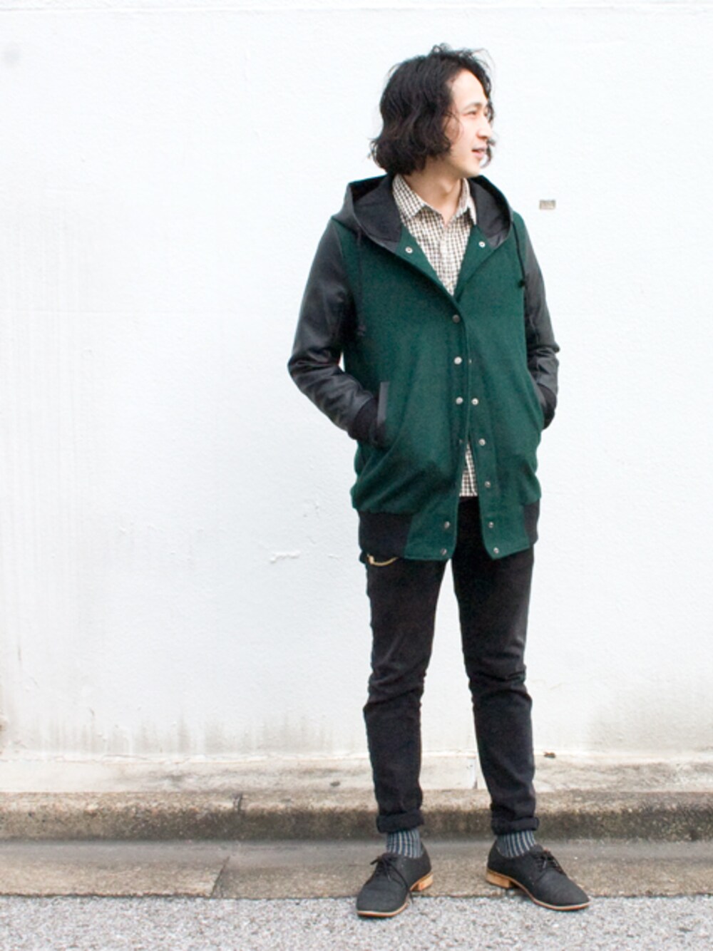 Hanjiroのスタジャン「メルトン*合皮フードロングスタジャン」を使ったコーディネート
