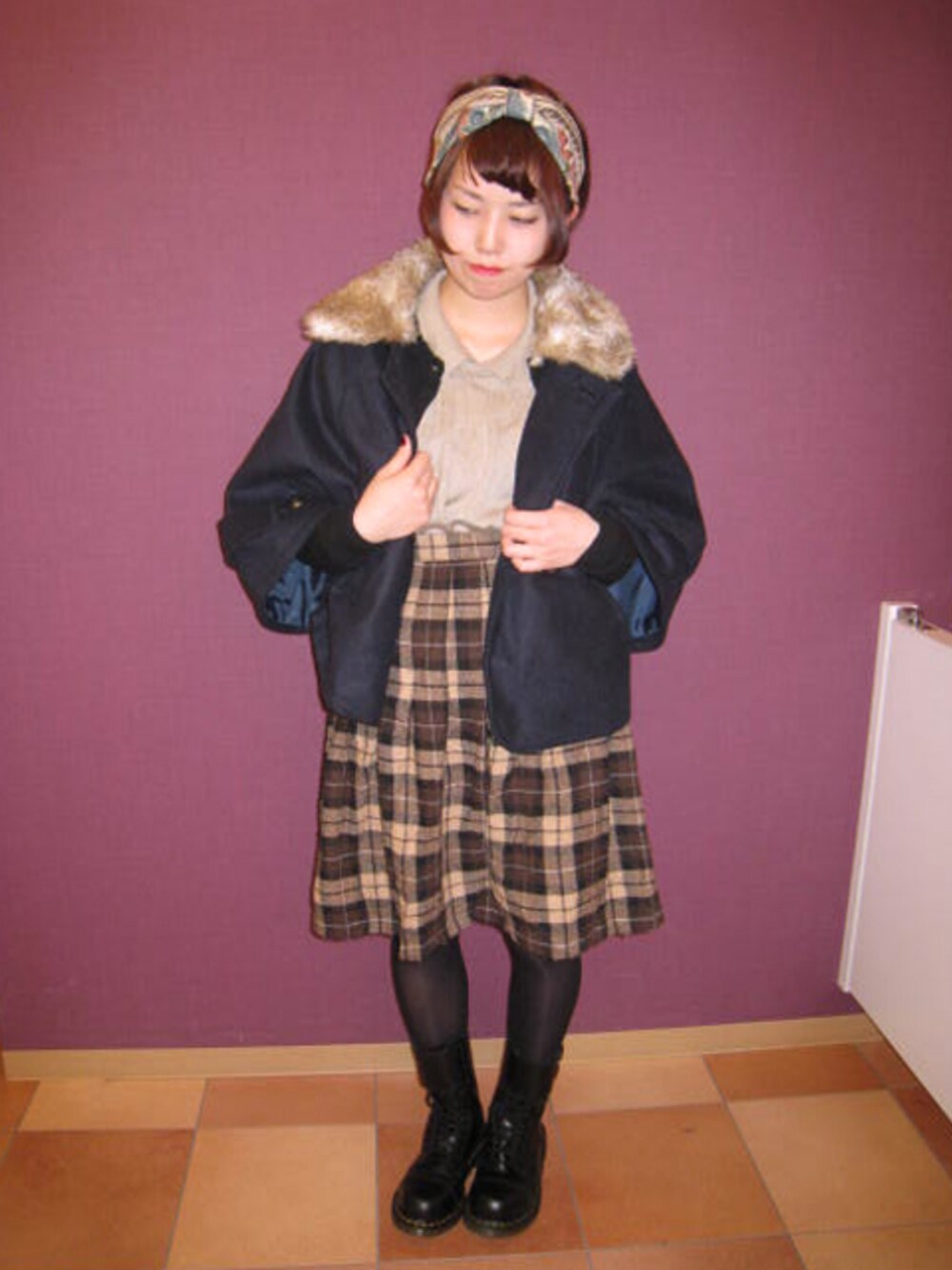 【13-3021-1014-01 ファー衿ポンチョ】 ¥6920 【usedセーター】 ¥1670 【usedウールスカート】 ¥3140 【13-0305-1101-01 リボンヘアバンド】 ¥2940 ふわふわフェイクファーが大人可愛いポンチョ風コートをUSEDアイテムでレトロに☆ 札幌店STAFF:根府