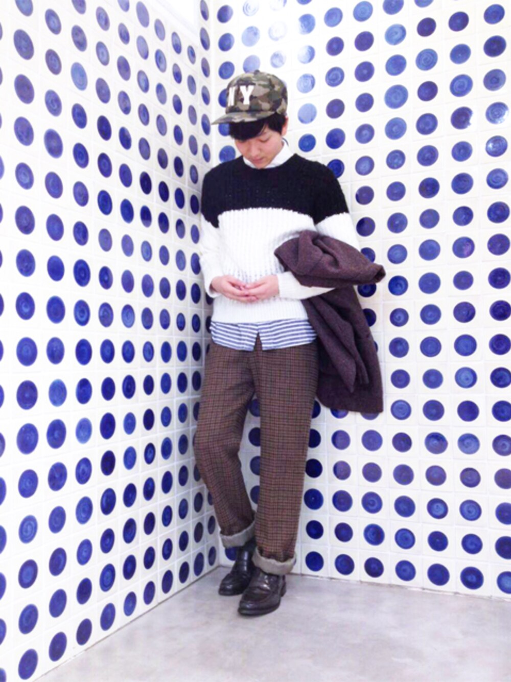 【usedテーラードジャケット】 ¥4190 【13-3014-1105-01 バイカラーセーター】 ¥4190 【13-1016-0904-01 OXボーダー切替長袖シャツ】 ¥4820 【usedタックパンツ】 ¥3770 【13-0305-1029-01 迷彩柄NYCAP】 ¥3675 【13-1049-0903-01 ローファー】 ¥4190 クラシカルな雰囲気のタックパンツをカジュアルにアレンジ! CAPでトレンドを意識したスタイリングに。 柏店STAFF:小川