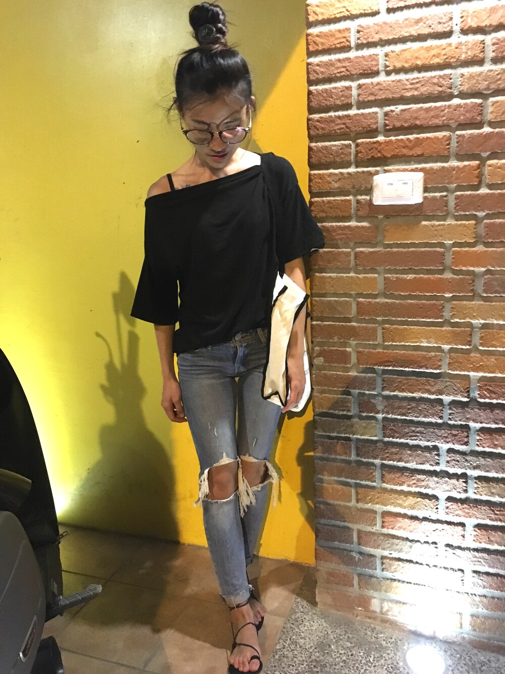 今年流行的破褲和ㄧ字領還有綁帶鞋,全部穿上,哈哈