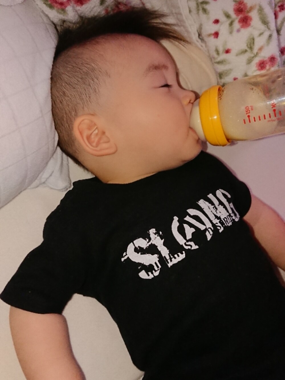 一歳の息子にSLANGの 何もしないお前に何がわかる 何もしないお前の何が変わる ロンパースを着せてミルク寝💤