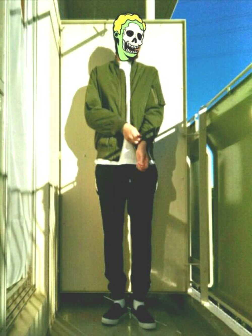 今日メチャクチャ雨降ってますが撮りためておいたやつです。 全身ビューティ&ユース(笑) カーキ×ネイビーを軸に少しの白でスポーティーな感じをプラスしました。 MA-1とサイドラインの入ったトラックパンツを合わせました。 シンプルでキレイめに着たかったのでトラックパンツはウール素材の物で。 スラックスのようなノリで着れるので便利。 スニーカーも馴染みやすいネイビーのスリッポンで。 モックネックTの色とソックスの色を合わせスポーティーな感じをプラスしてます。