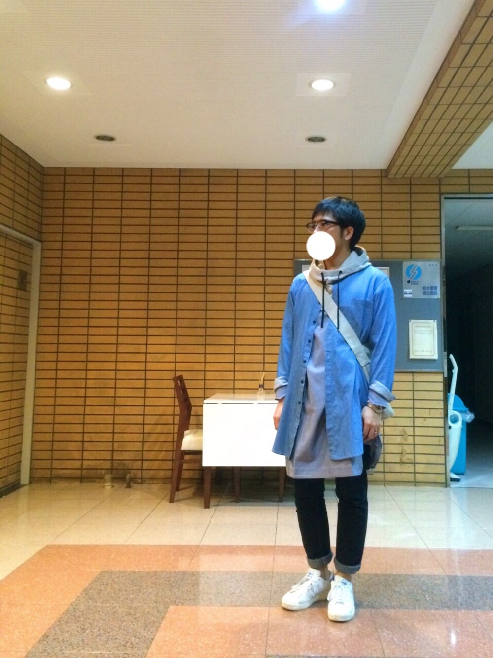 ブルーめがね 雨が続いて気分がブルー... という訳ではなく。 今回投稿の服装 青系のアイテムばっかです。 ちなみに天気はくもりが好きです。 今回の投稿に命名すると 「先日ロング丈のデニムシャツを購入し、 うきうき気分で家に帰ったところ 予約注文していた商品が家に届いていて、 興奮した勢いで合わせてみたら 意外と気に入ってしまったコーデ」です。 hatraのシャツとパーカーが ドッキングしたやつの上に スタンドカラーのロングデニムシャツ、 それにユニクロスキニーを ロールアップして履きました。 上記の名の通り 今回の投稿の格好は偶然したものでした。 きっとこの偶然が無かったら 考えなかった格好だと思います。 ファッションってある程度 方程式というか、 定説みたいなものがあって 「これにはこれが合う!この時はこう!」 なんてのが有りますが、 そういうものを意識し過ぎて 頭で考えた格好をいざしてみると 思ったよりも合ってなかったり、 むしろ変だったりする事が 僕は度々あります。 逆に、朝起きた時に直感で [今日はアレとアレを着たい!]と思い 実際に着てみるとその組み合わせが 意外と良かったりします。 ファッションってやっぱ 感覚に左右されるものだと思うので あまり頭でっかちになってしまうのは 良くないですね。 結局それで 何が言いたいのかというと 僕の友人へ 先日は待ち合わせに遅れて 大変すみませんでした。 上記にあります通り、 前日になんとなく考えていた服装が 朝着替えた時に予想以上に変で、 パニックになってしまい 結果遅れました。 今後はこのようなことが無いよう 3通りの服装を考えてから 寝るようにします。 いや、あなた そんなことしてないで 早く寝て早く起きなさいよ。 以上です。 今回も偉そうにダラダラと 長文・駄文、失礼致しました。 これを見て気が向いた方 何か反応を戴けますと もれなく僕が喜びます。 宜しくお願い致します。
