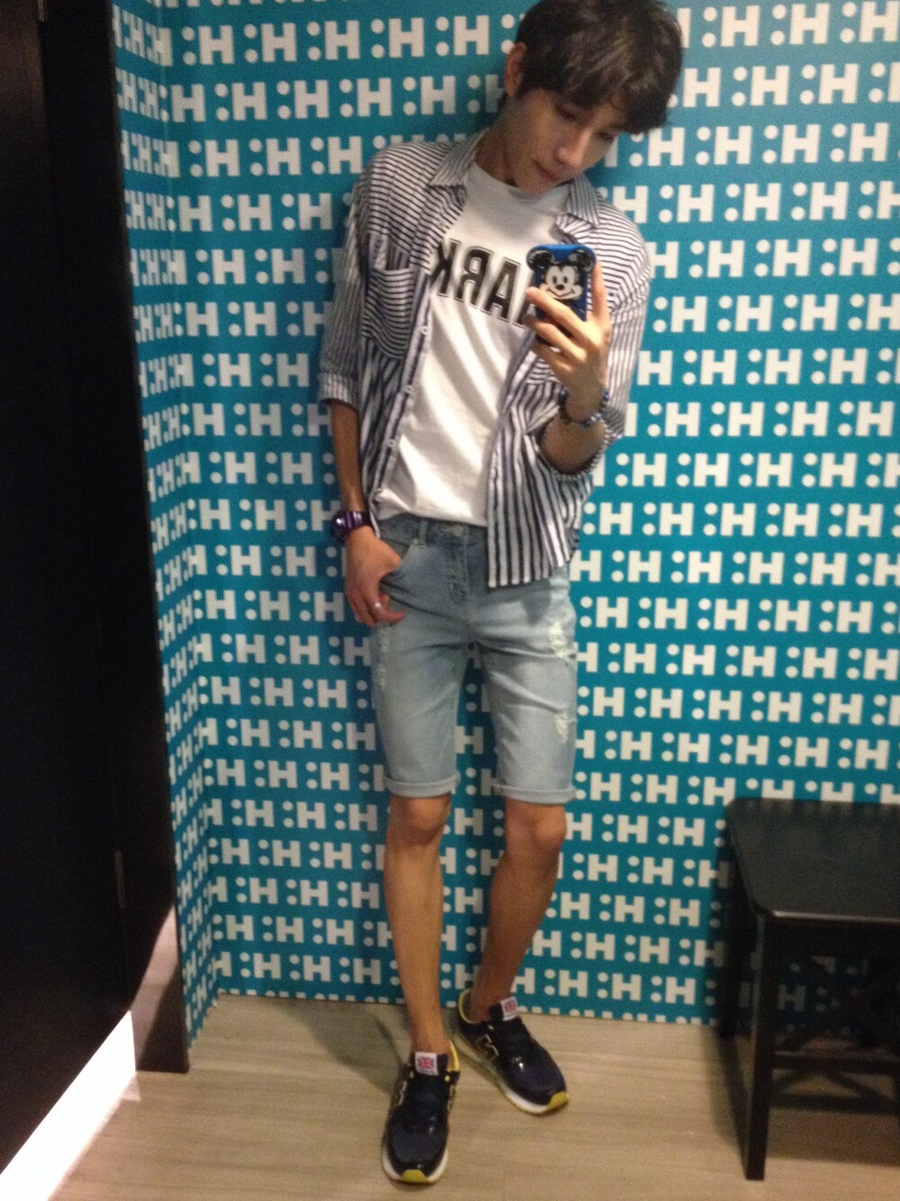 白色配上直條紋的外套式襯衫在配上韓國春夏流行五分褲在搭上運動休閒鞋 可以時尚又休閒的運動風穿搭