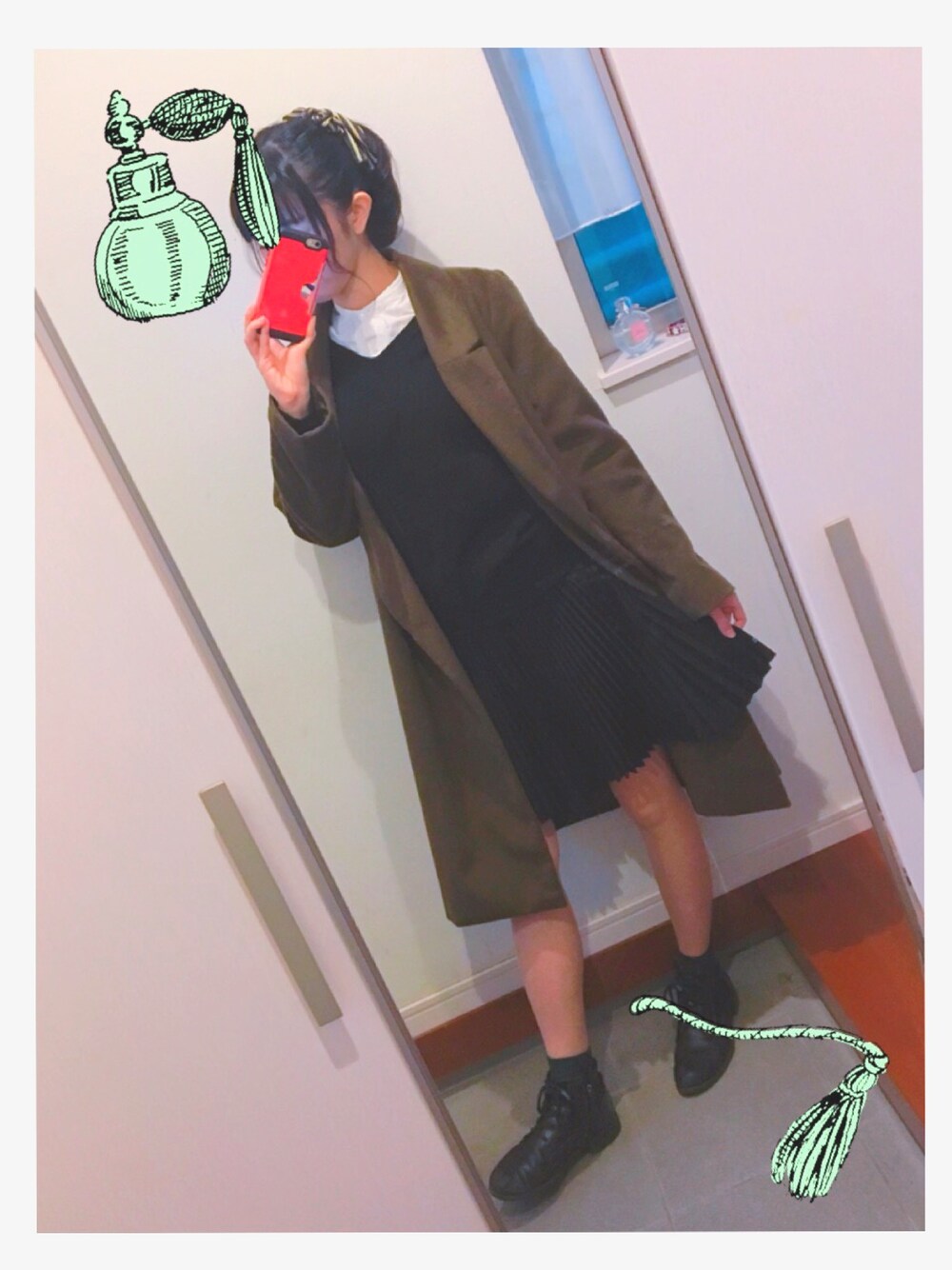 コートの中は 黒×白の大人しめコーデ グリーンを差し色(๑・̑◡・̑๑)✴︎ ポニーテールに結んだリボンのヘアゴム お気に入り☺︎❤︎