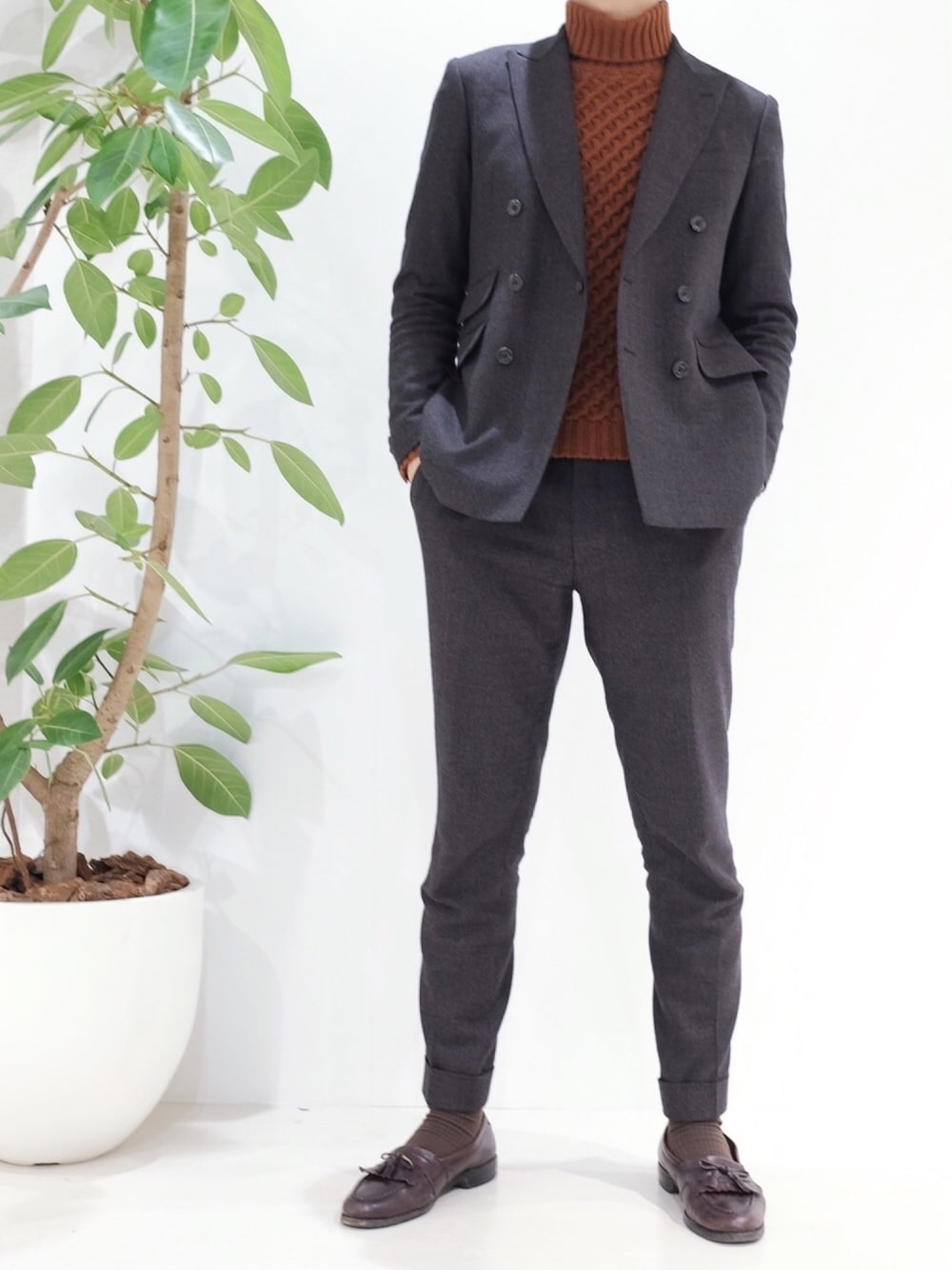FABRIC TOKYOのスーツを軸にシンプルに同系色でまとめました。 起毛系の生地なのでこんな感じでセットアップ風に着ても合うし、上下別々にでも着れるので重宝してます。