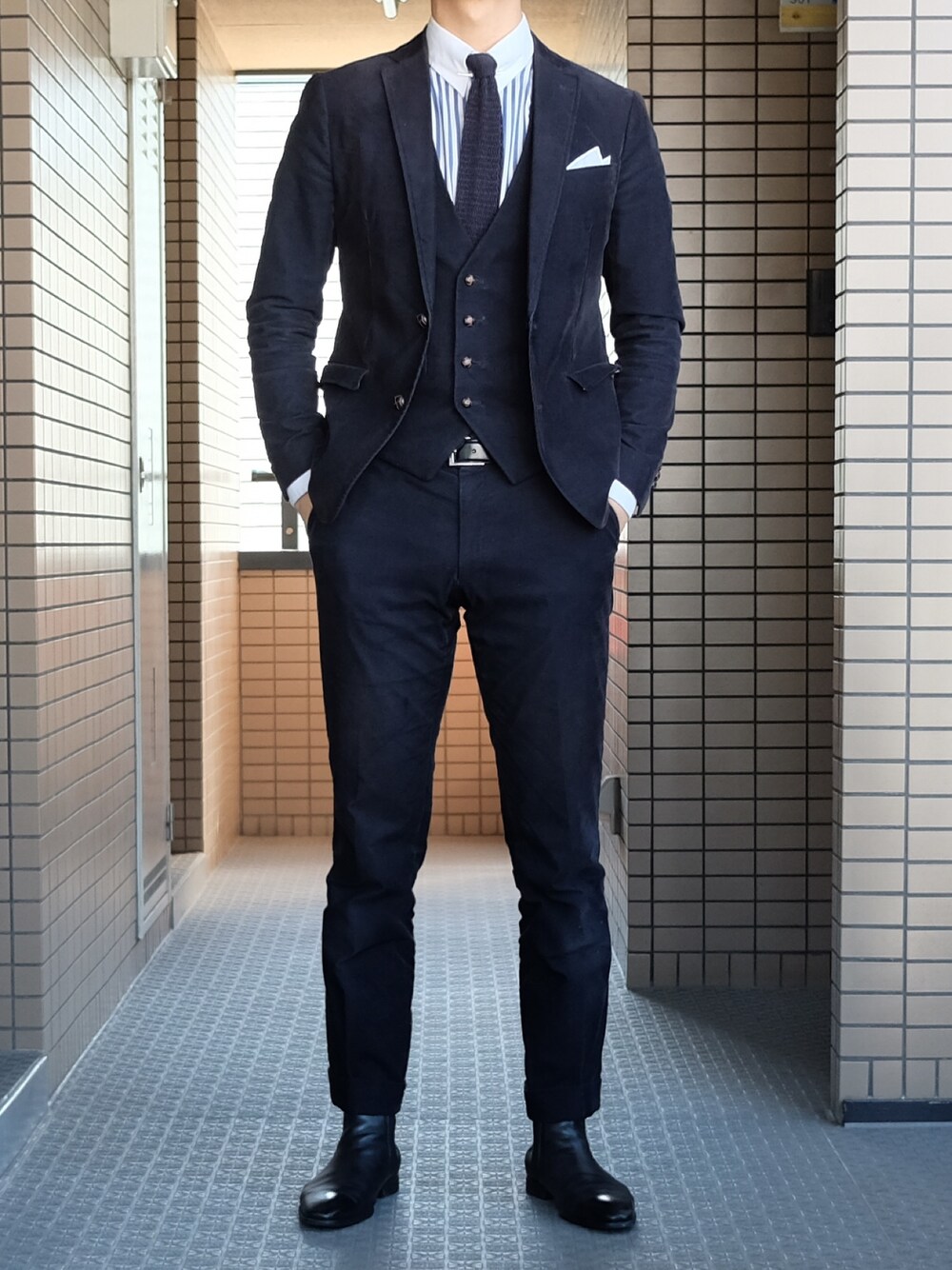 コーデュロイスリーピーススーツを使ったオーセンティックなコーディネートです。 Vゾーンはワントーンでまとめ、カラークリップを使うことでよりクラシックな印象を出しました。 チーフは、映画華麗なるギャツビーで主人公のニックがしていた入れ方を参考にしました。 シューズはサイドゴアでミニマルにまとめました。