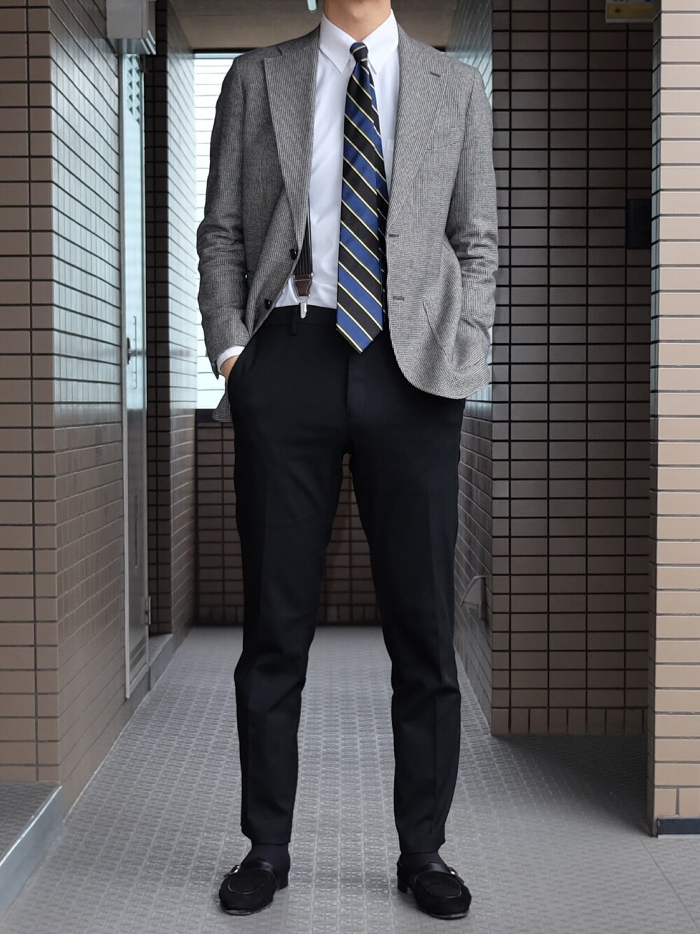 モノトーン+ブルー ブレイシーズでクラシックにまとめました。