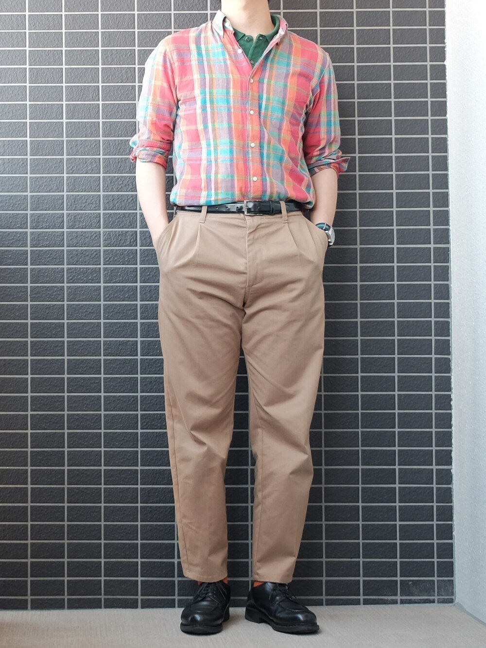80'sのフレンチアイビーを意識し、マドラスチェックシャツの中にフレラコを合わせました。 足下はローファーでもよかったんですが、あえてシャンボードにしました。